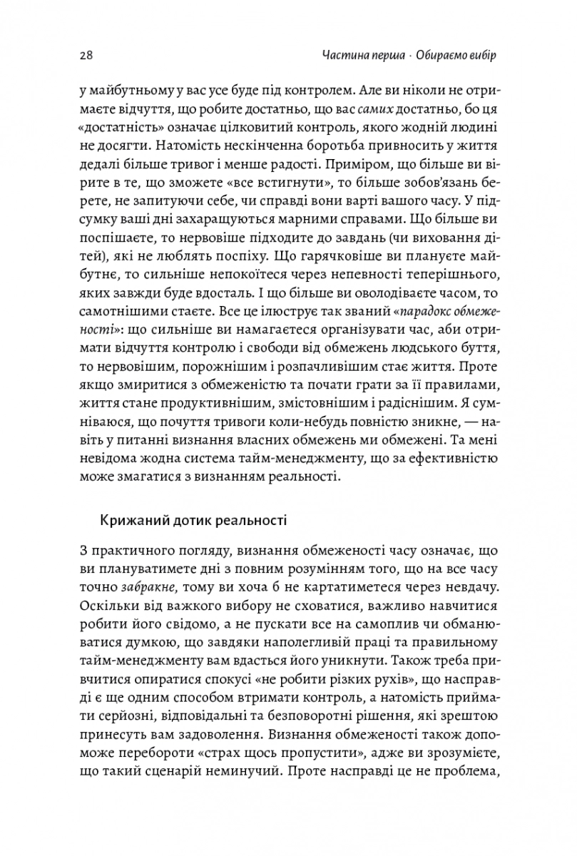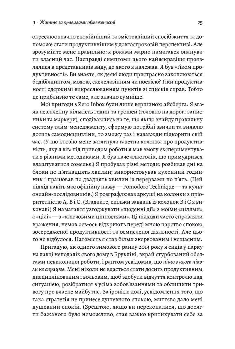 - Дає зрозуміти, що наші цілі часто формуються під впливом нав’язаних нам ідеалів. Беркмен доводить, що кожен має сам вирішити, що для нього є найважливішим і витрачати свій час саме на це.