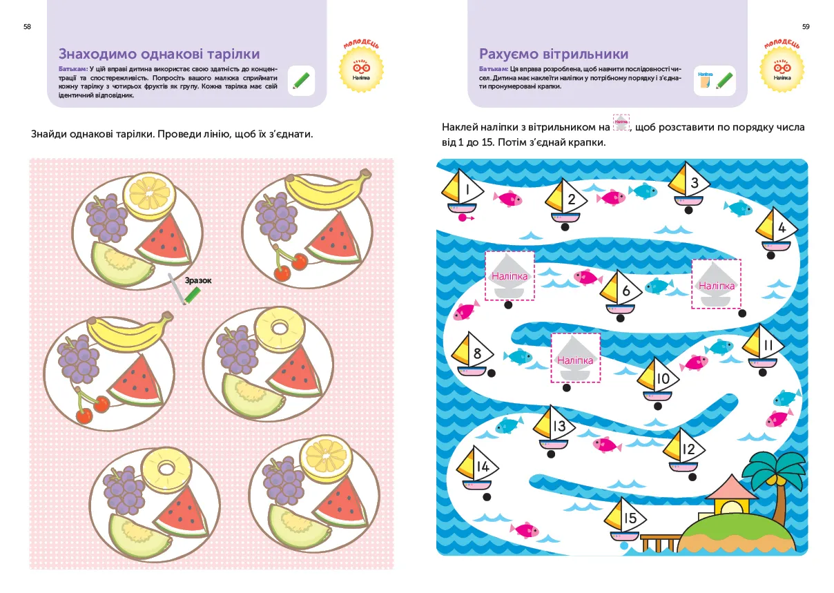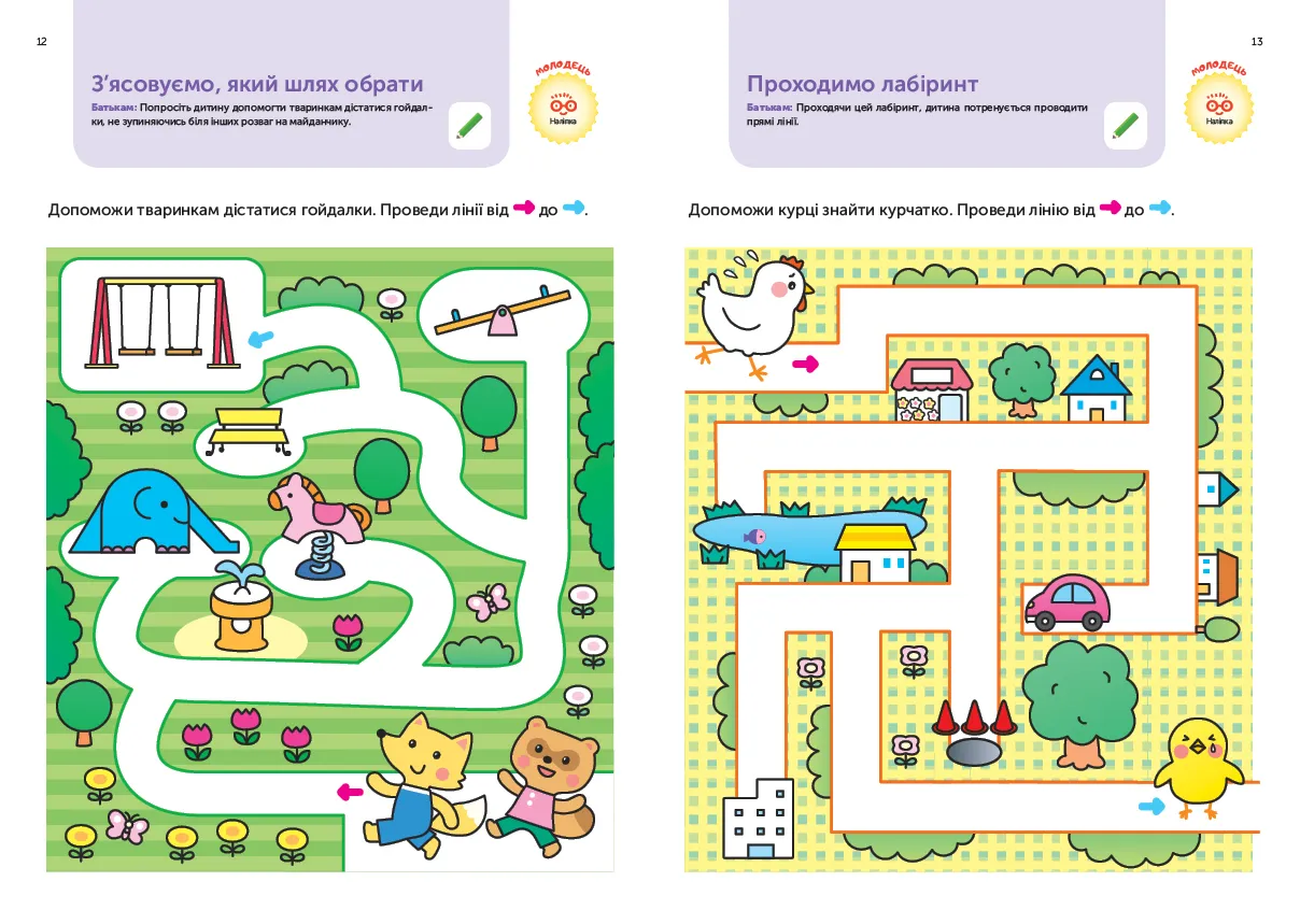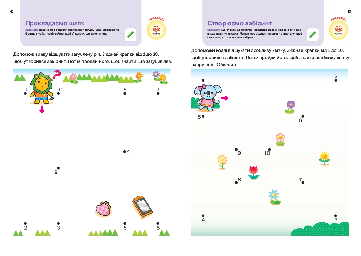 Працюючи з цією книжкою, дитина попрактикується наводити лінії і контури, розфарбовувати, з’єднувати крапку за крапкою, опанує ігри з числами, проходження лабіринтів. Веселі вправи легко розвинуть уважність, дрібну моторику і підготують до школи!
