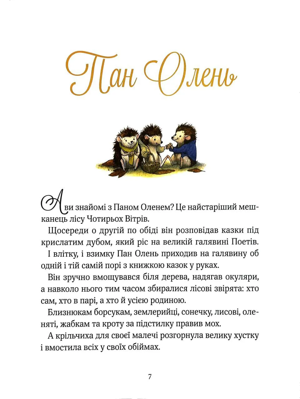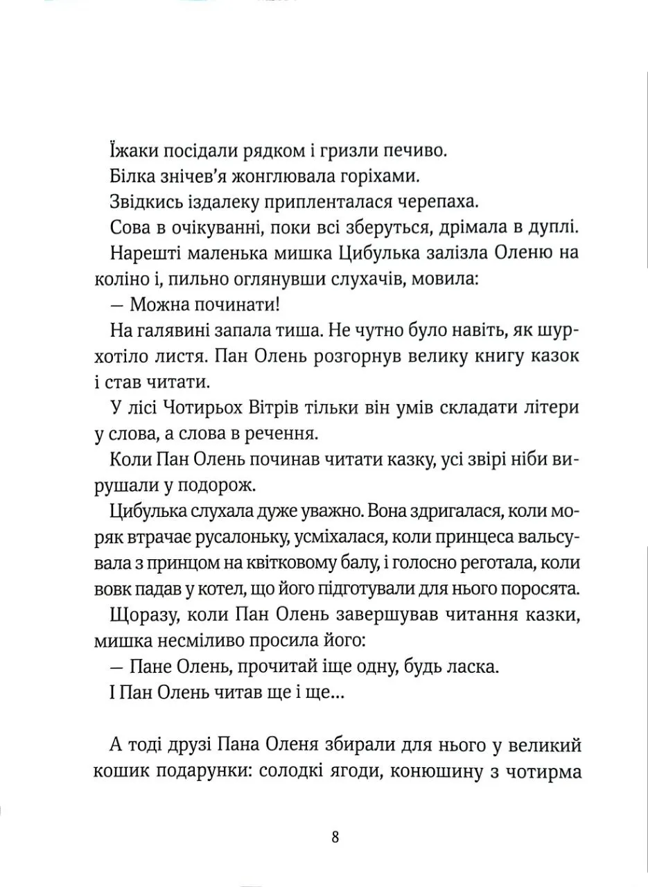 Одного дня ви розкриєте цю книжку і поринете у світ яскравих пригод, сповнених подиху теплого вітру та усмішок друзів. На вас чекатиме шляхетний Пан Олень, якому мишка Цибулька допомагає відшукати загублені сторінки з книжки казок. Ви опинитеся у чарівній атмосфері Різдва у родині пухнастих кроленят. Завітаєте до старого самотнього ведмедя, який знайшов родину солов’їв, що оселилися в його поштовій скриньці…Нехай вас заколисують ці надзвичайно теплі, мов плетений коцик, та сповнені затишку бабусині казочки, які сподобаються і малим, і дорослим.
