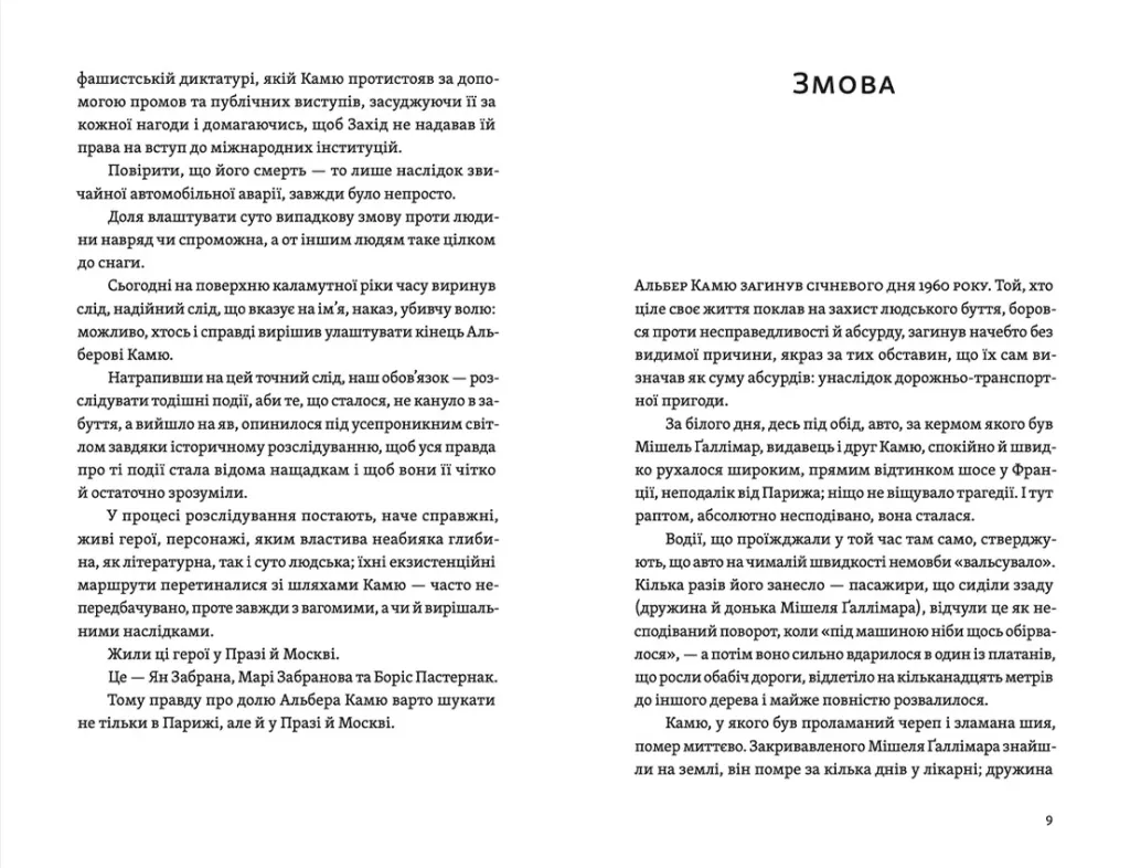 Як можуть бути пов’язані вбивства Альбера Камю, Лева Ребета та Степана Бандери? Чому Камю — француз, лауреат Нобелівської премії з літератури — так дратував радянську владу в часи Холодної війни? Що насправді криється за численними, дивними смертями по всій Європі, які залишаться в історії просто нещасними випадками?1960 року в дивній, за словами очевидців, автокатастрофі загинули Альбер Камю та його друг і видавець Мішель Галлімар. А через кілька десятиліть до рук італійського письменника Джованні Кателлі потрапляють факти, які ставлять під сумнів загальноприйняту версію. Ґрунтуючись на ретельному документальному дослідженні, Джованні Кателлі будує переконливі й сенсаційні гіпотези того, що 46-річний філософ і письменник Альбер Камю став жертвою навмисного, спланованого вбивства КДБ.