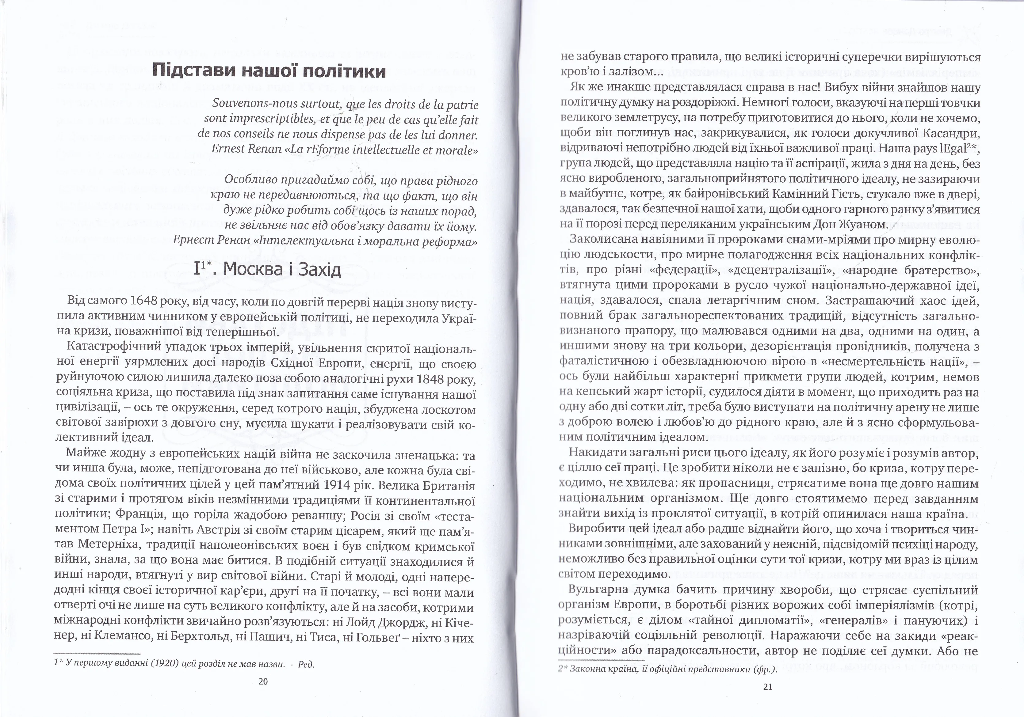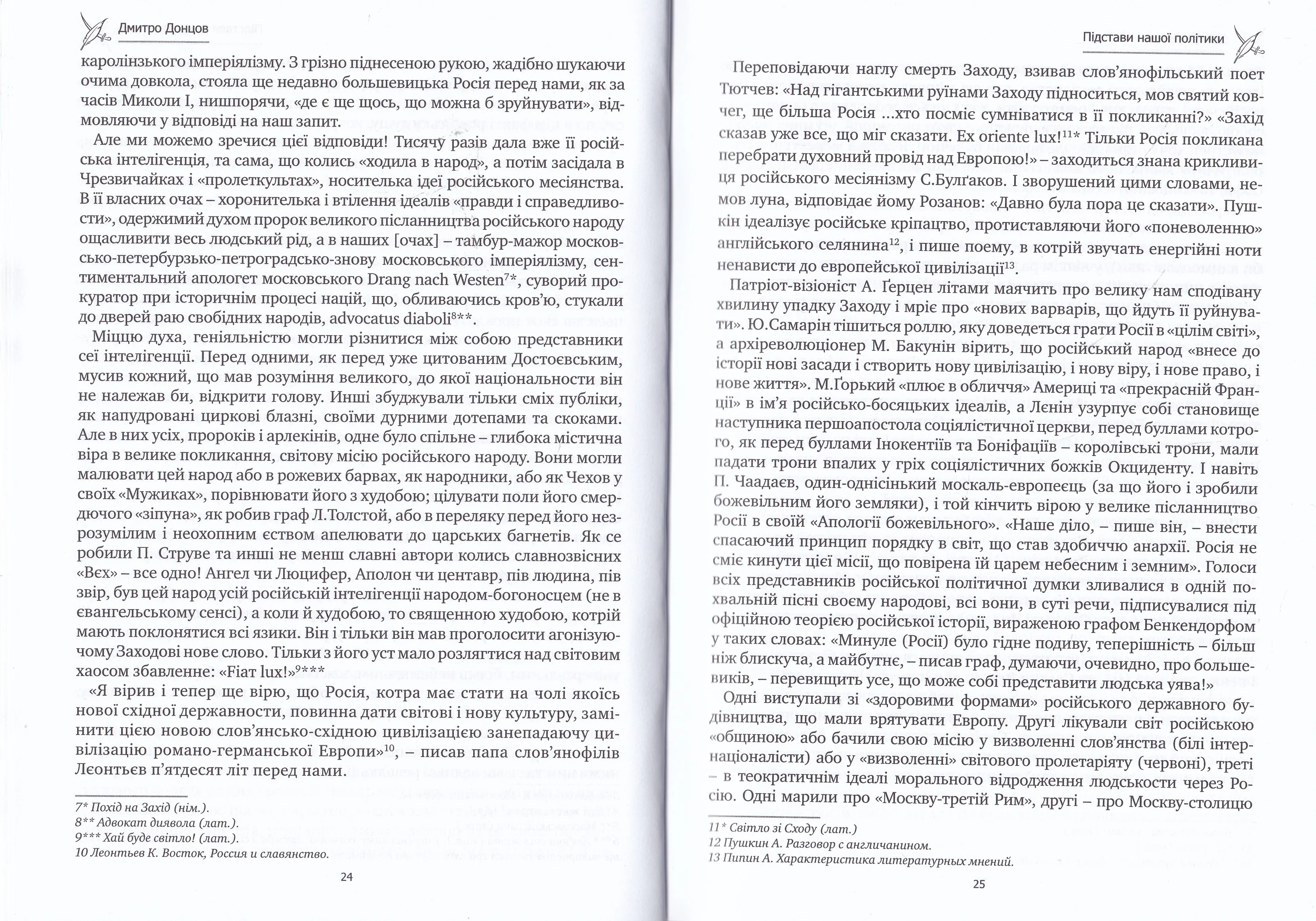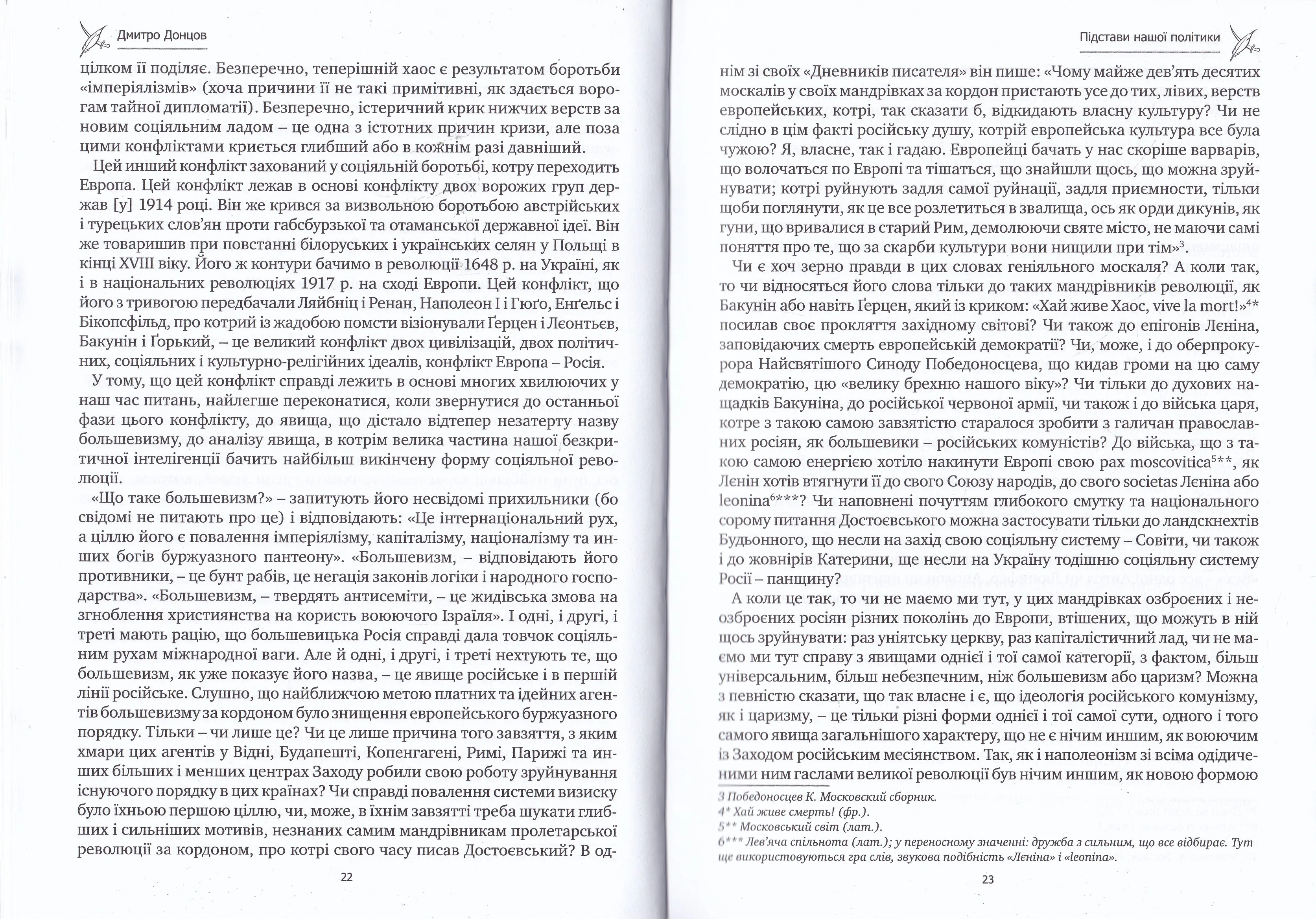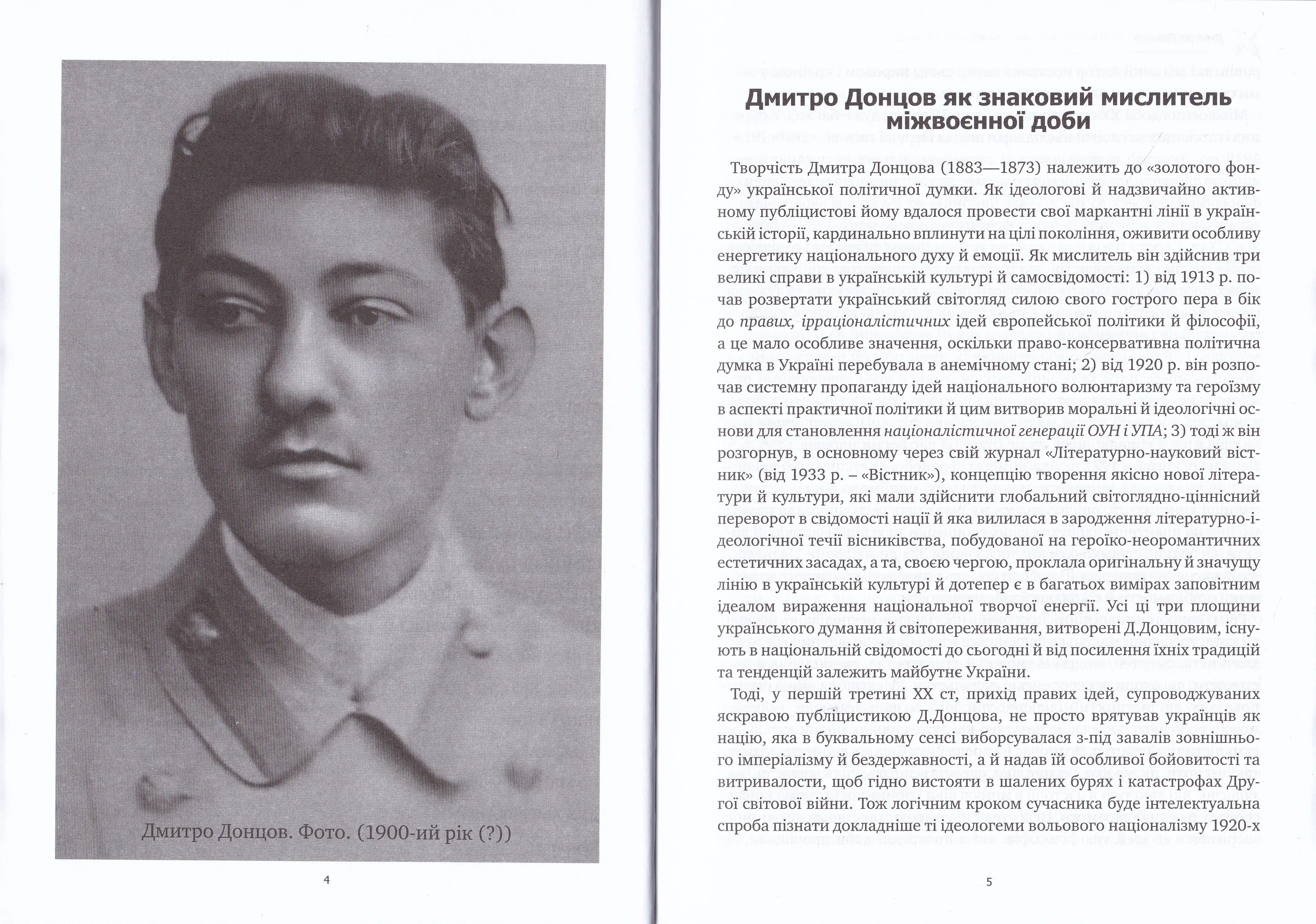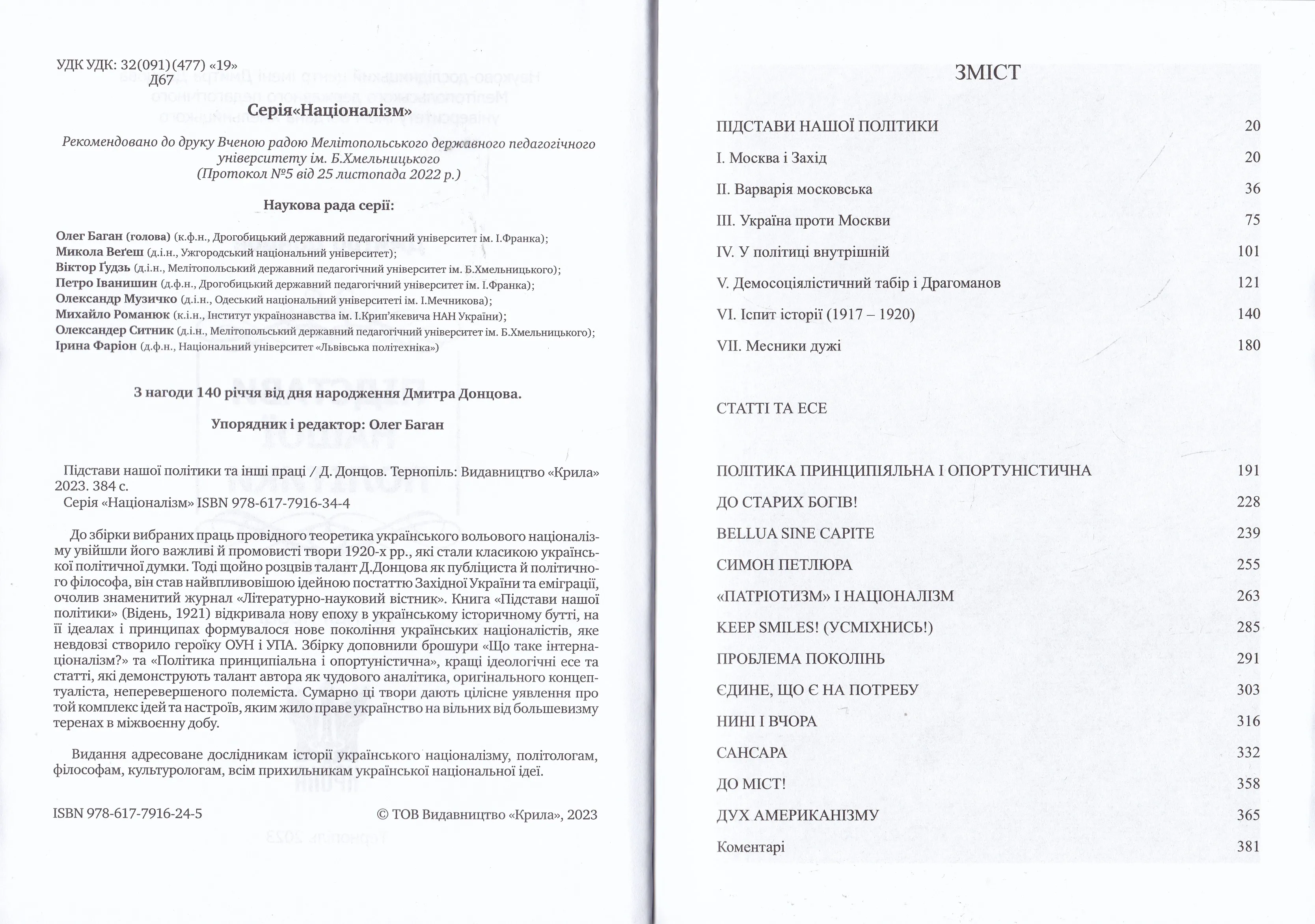 До збірки вибраних праць провідного теоретика українського вольового націоналізму увійшли його важливі й промовисті твори 1920-х рр., які стали класикою української політичної думки. Тоді щойно розцвів талант Д. Донцова як публіциста й політичного філософа, він став найвпливовішою ідейною постаттю Західної України та еміграції, очолив знаменитий журнал «Літературно-науковий вістник».Книга «Підстави нашої політики» (Відень, 1921) відкривала нову епоху в українському історичному бутті, на її ідеалах і принципах формувалося нове покоління українських націоналістів, яке невдовзі створило героїку ОУН і УПА. Збірку доповнили брошури «Що таке інтернаціоналізм?» та «Політика принципіальна і опортуністична», кращі ідеологічні есе та статті, які демонструють талант автора як чудового аналітика, оригінального концептуаліста, неперевершеного полеміста. Сумарно ці твори дають цілісне уявлення про той комплекс ідей та настроїв, яким жило праве українство на вільних від большевизму теренах в міжвоєнну добу.