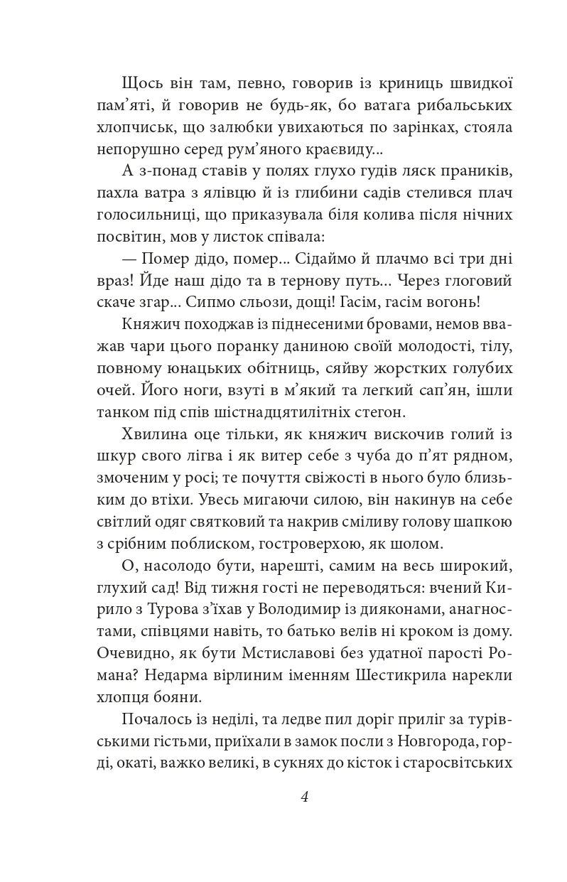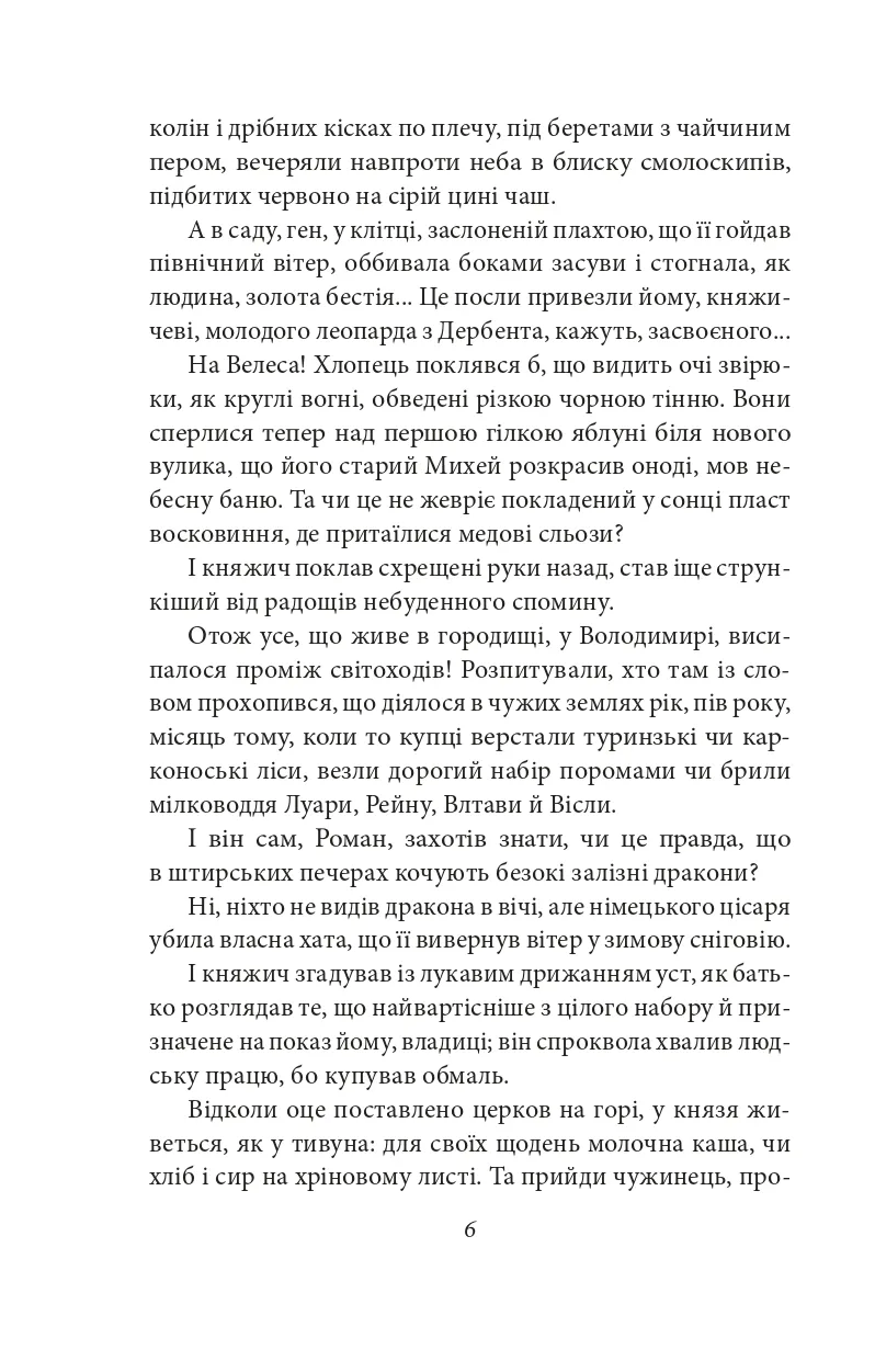 Основою історичної повісті «Шестикрилець» (1935) стали події на Галицько-Волинській землі другої половини XII — початку XIII ст. Увага авторки зосереджується на основних подіях життя князя Романа Мстиславича: подорож до Угорщини, одруження з Рюриківною, похід на ятвягів, боротьба з великим боярством, укріплення західних кордонів, зміцнення зв'язків із півднем, боротьба з половцями, посилення єдності Русі, незгода з Рюриком Київським, похід на Польщу і смерть великого будівничого своєї держави.