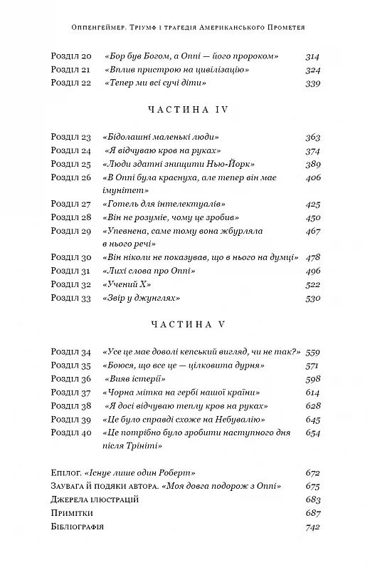 У пустелі Нью-Мехіко 16 липня 1945 р. таємно підірвали першу атомну бомбу. Вражений руйнівною силою свого творіння, Дж. Роберт Оппенгеймер, керівник Мангеттенського проекту, відтоді затявся боротися проти розробки водневої бомби та не допустити ядерної війни. Утім подальші випробування зброї масового ураження на містах Хіросіма й Нагасакі звели нанівець усі його старання. Оппенгеймера підозрювали в тому, що він комуніст і шпигун СРСР. Він зазнав утисків і переслідувань з боку ФБР і мусив полишити будь-яку громадську діяльність. Його приватне життя так само зазнало втручань: його телефон прослуховували, дружину Роберта виставляли запійною п’яничкою, а йому приписували низку позашлюбних стосунків і з жінками, і з чоловіками. І так само, як створення атомної бомби знищило Оппенгеймера як науковця і публічну персону, ще жахливіша бомба знищила його тіло й розум. І цю бомбу він утримував у собі до останньої хвилини, намагаючись не допустити тепер уже індивідуальної катастрофи. Лише 1963 р. президент Кеннеді реабілітує його, і завдяки цьому постать Оппенгеймера набула іншого значення для усього світу. Книга «Оппенгеймер. Тріумф і трагедія Американського Прометея» є втіленням 30-ти років інтерв’ю з родиною, друзями й колегами Оппенгеймера, пошуків у файлах ФБР, результатом аналізу записів промов і допитів, знахідок приватних документів. Скрупульозна біографія, у якій означено засадничі для наукового світу й історії загалом віхи життя найвідомішого вченого свого покоління, однієї зі знакових постатей ХХ ст., для якої тріумф і трагедія міцно переплелися гордієвим вузлом.