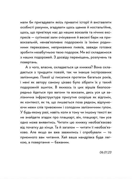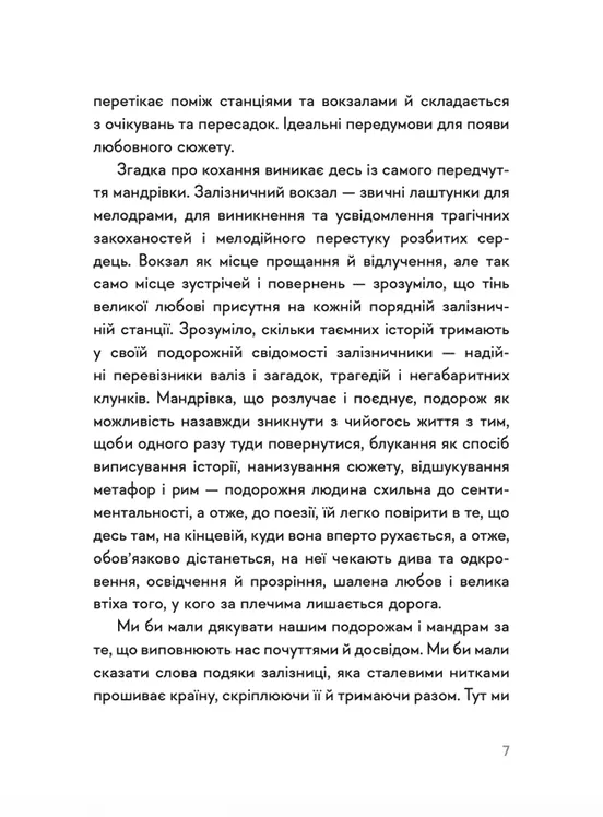 Із самого дитинства ми сприймаємо залізницю не лише як щось, пов'язане із транспортом, а як велику таємницю, що дозволяє вирушити в мандрівку, здолати відстань, долучитися до великого простору, здобути новий досвід. З мандрами й поїздками нерозривно зв'язані й любовні переживання, розлуки та зустрічі, перестук розбитих сердець чи ніжні й тремкі обійми на перонах. Вздовж залізниці твориться історія країни. У книжці Сергія Жадана читачі знайдуть поезії, що писалися протягом багатьох років, прямо чи опосередковано пов'язані із залізницею. Тут вокзальна площа приходить у сни, люди, схожі на равликів, сплять на вокзалах і несуть на своїх плечах власні домівки, військові вирушають на Схід боронити країну та повертаються до рідних. Під тихий стук коліс та пізні гудки пасажири рахують засніжені пагорби, сонні долини, заміські будівлі, а заклопотані провідники блукають вагонами й розганяють сновидіння.«30 віршів про любов і залізницю» — це поетична ода мандрівці, дорозі та любові.