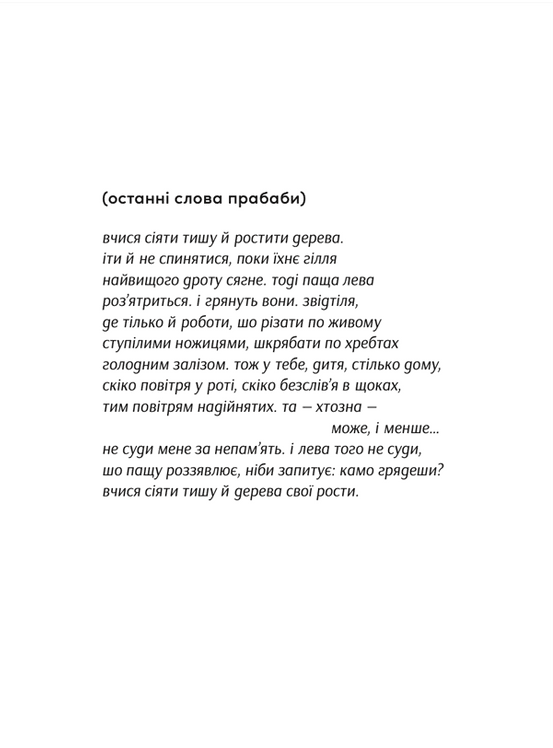 Вірші із цієї збірки написані до початку повномасштабного вторгнення, але війна там присутня — мовчанням, страхом, недопрожитим життям. Інша, з іншими досвідами переселення і втрат, про які не моглося говорити, які хотілося стерти з пам’яті, але вони нікуди не зникали, добували зі своїми носійками до самої старості. І вже вона розмикала їм вуста, гнала розповісти себе, незґрабно, хаотично, бодай для когось.Ці тексти — намагання почути. Зафіксувати окремі слова та історії людей, місць, подій. Доповнені ілюстраціями авторки, де реальне переплетене з можливим, вони творять хистку атмосферу знайомого світу-який-зникає разом із літніми жінками, бабами, відунками кожного покоління.