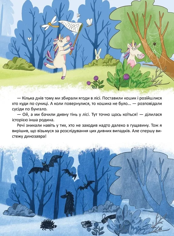На щастя, герой з веселковою гривкою рішуче приєднується до компанії. Єдиноріг вже готовий присвятити себе відпочинку та дослідженню місцевих смаколиків, проте хащі прадавнього лісу чомусь зовсім не дружні й сповнені небезпек. Які страшні істоти мешкають тут? Невже динозаври?! Єдиноріг та діти мають розкрити цю таємницю, аби канікули не було зіпсовано...