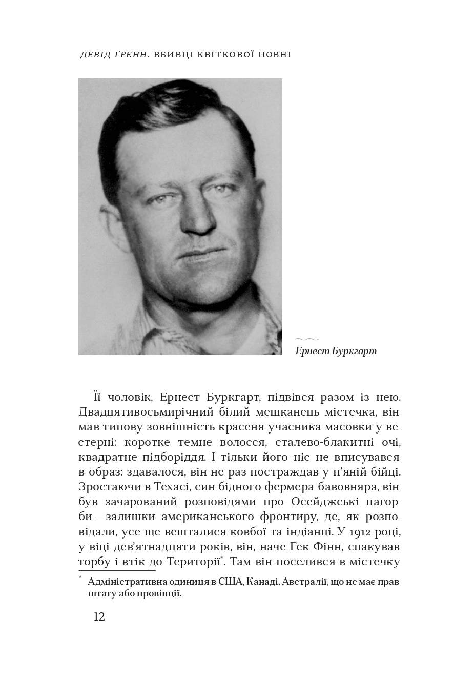 1920-ті роки. Хвиля таємничих убивств та зникнень прокочується племенем осейджів; на їхній території в Оклахомі було знайдено нафту, і вони - один з найзаможніших народів світу за доходом на душу населення. Родичів Моллі Буркгарт отруюють і розстрілюють одне за одним. Та це лише початок - скоро гинути починають і інші члени племені, а також ті, хто брався розслідувати ці вбивства самотужки.Молодий директор ФБР Дж. Едґар Гувер береться за справу, яка стала однією з перших для агенції. Він наймає колишнього Техаського Рейнджера Тома Вайта і формує команду підпільних оперативників, аби розплутати цю таємницю.Історична документальна розвідка Девіда Ґренна занурить читача у світ жадоби і корупції на території останнього клаптика Дикого Заходу США.