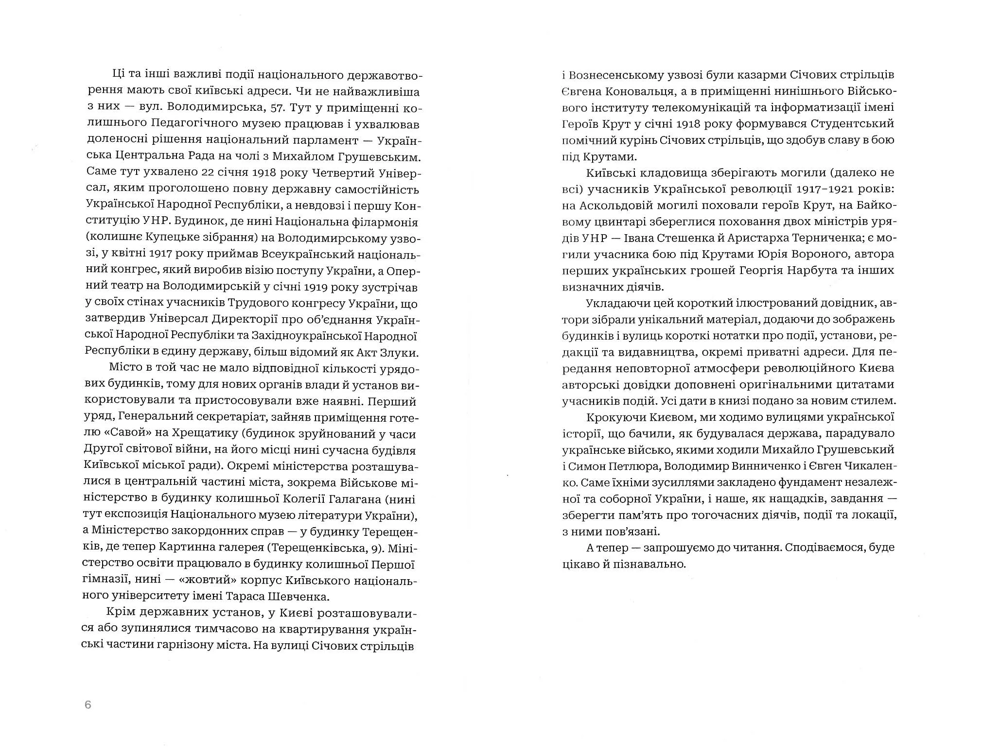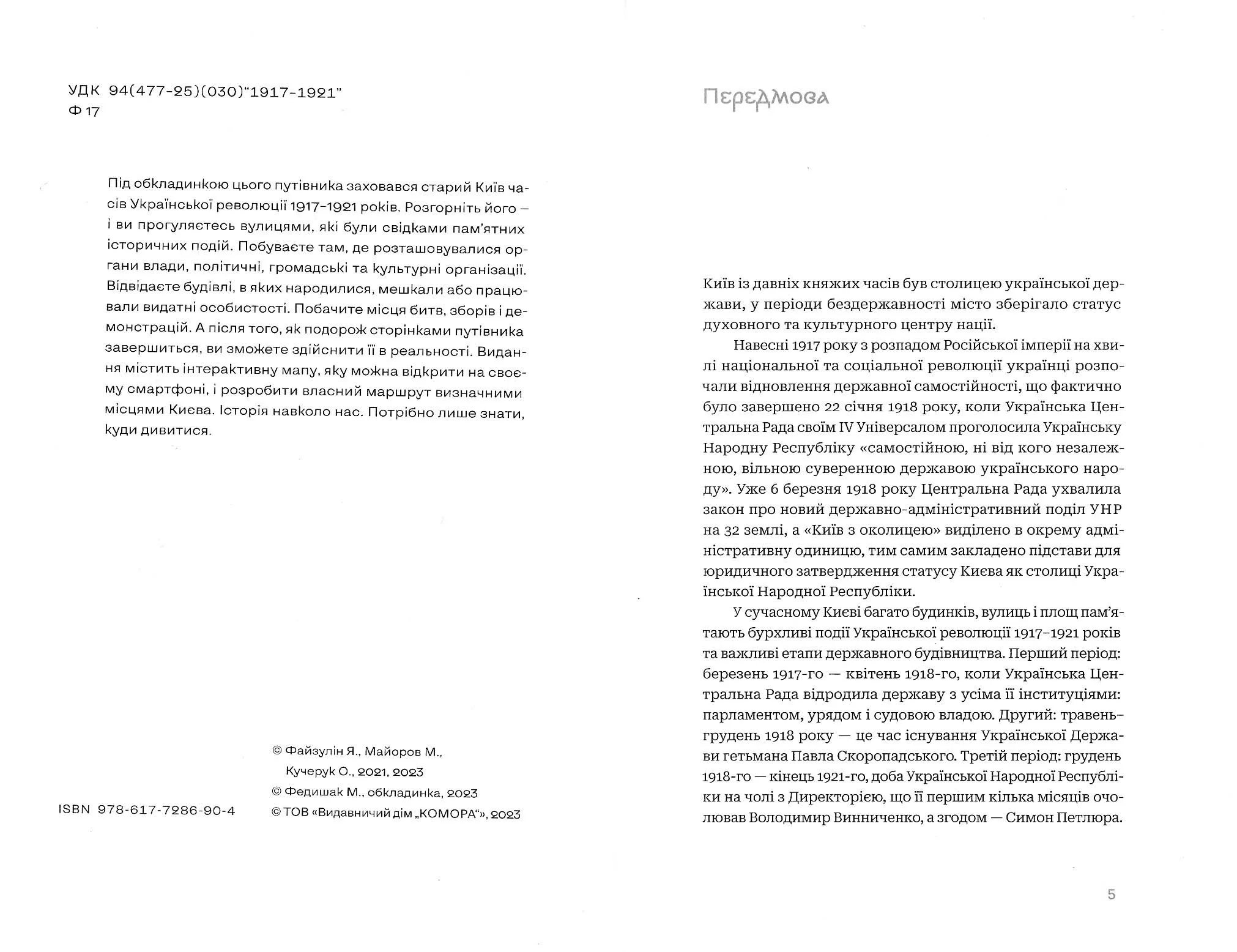 Під обкладинкою цього путівника заховався старий Київ часів Української революції 1917–1921 років. Розгорніть його — і ви прогуляєтесь вулицями, які були свідками пам’ятних історичних подій. Побуваєте там, де розташовувалися органи влади, політичні, громадські та культурні організації. Відвідаєте будівлі, в яких народилися, мешкали або працювали видатні особистості. Побачите місця битв, зборів і демонстрацій. А після того, як подорож сторінками путівника завершиться, ви зможете здійснити її в реальності.Видання містить інтерактивну мапу, яку можна відкрити на своєму смартфоні, і розробити власний маршрут визначними місцями Києва. Історія навколо нас. Потрібно лише знати, куди дивитися.