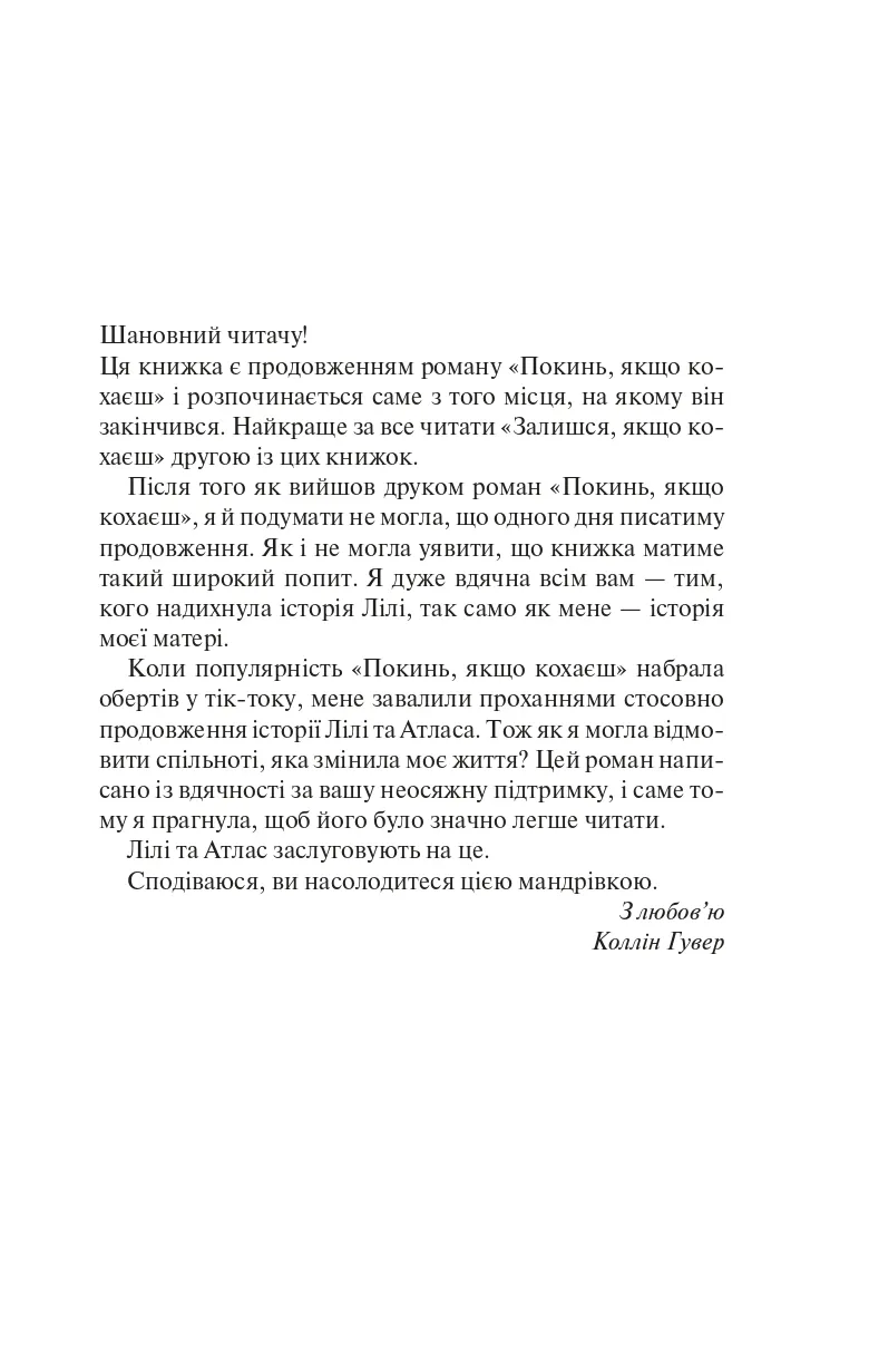 Коллін Гувер — сучасний феномен. Перша книжка була надрукована авторкою власним коштом, але видавництва не зацікавилися романом. Тоді вона змінила тактику і стала популярною в інтернет-спільнотах. Врешті Гувер стала зіркою літератури: зараз її книжки стають бестселерами, їх радять голлівудські знаменитості і змітають з полиць прості читачі, які діляться своїми відгуками у соцмережах. Тому, наприклад про Гувер вже є понад пів мільярда згадок у TikTok.