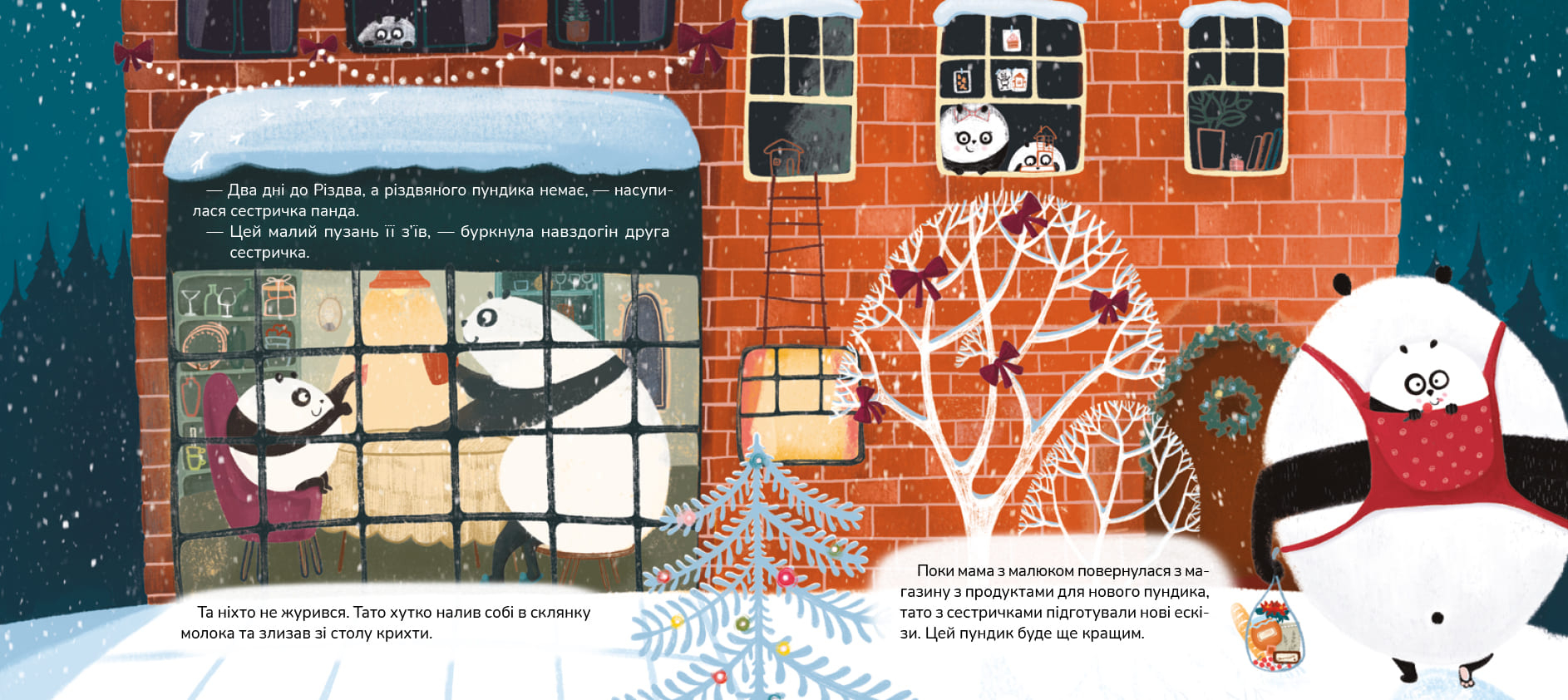 Напередодні Різдва панди мають чимало клопоту. А тут ще й різдвяний пундик ніяк не вдається спекти — усе щось не так щоразу. А він же має бути найособливіший, найріздвяніший, найкращий! Однак панди не опускають лапок, а старанно беруться пекти ще один. Зайвим він точно не буде. Ця затишна історія чудово пасує до зимових вечорів та теплого молока. Для дітей від 3 років.