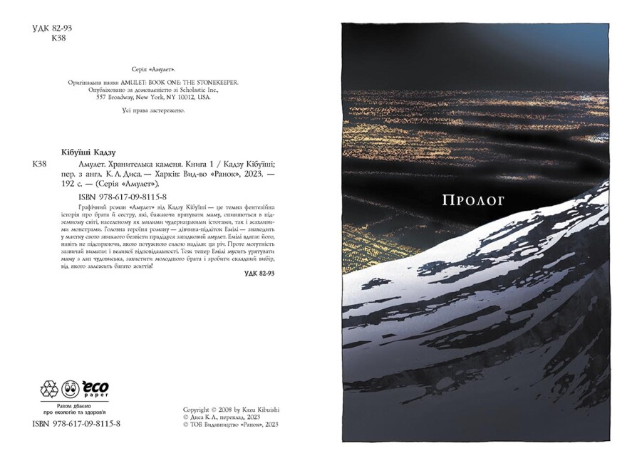 Графічний роман «Амулет» від Кадзу Кібуїші — це темна фентезійна історія про брата й сестру, які, бажаючи врятувати маму, опиняються в підземному світі, населеному як милими чудернацькими істотами, так і жахливими монстрами. Головна героїня роману — дівчина-підліток Емілі — знаходить у маєтку свого зниклого без вісти прадідуся загадковий амулет. Емілі вдягає його, навіть не підозрюючи, якою потужною силою наділяє ця річ.Проте могутність зазвичай вимагає і великої відповідальності. Тож тепер Емілі мусить урятувати маму з лап чудовиська, захистити молодшого брата і зробити складний вибір, від якого залежить багато життів!