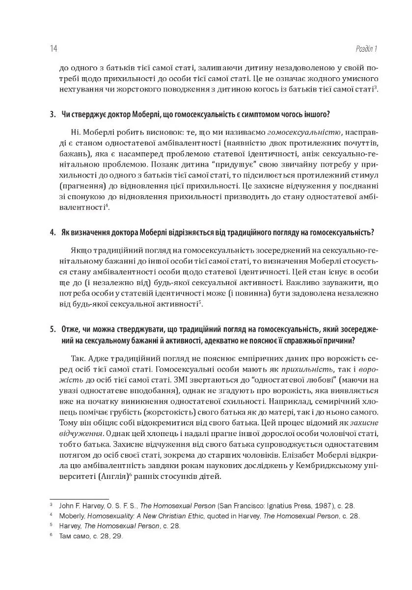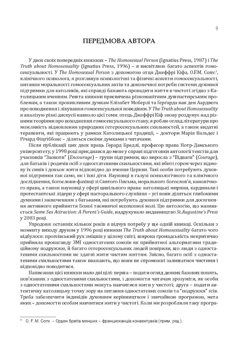Праця розглядає не тільки основні аспекти патологічної природи гомосексуалізму, але й практичні питання допомоги людям із гомосексуальними схильностями. Серед її розділів є такі: «Гомосексуальність: кілька основних питань», «Допомога особам з одностатевими схильностями жити у чистоті: душпастирські міркування», «Одностатеві зв’язки і здоров’я суспільства», «Свобода волі та залежність».