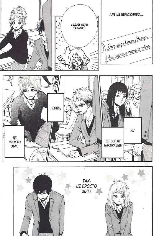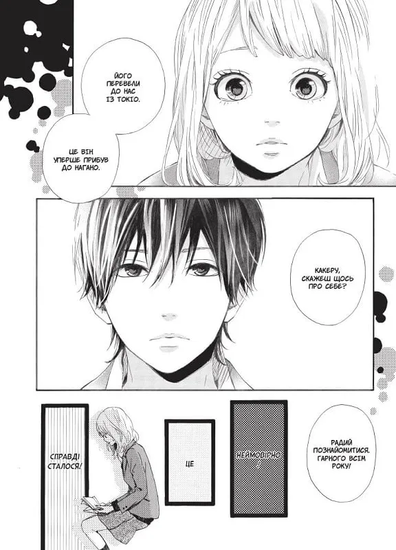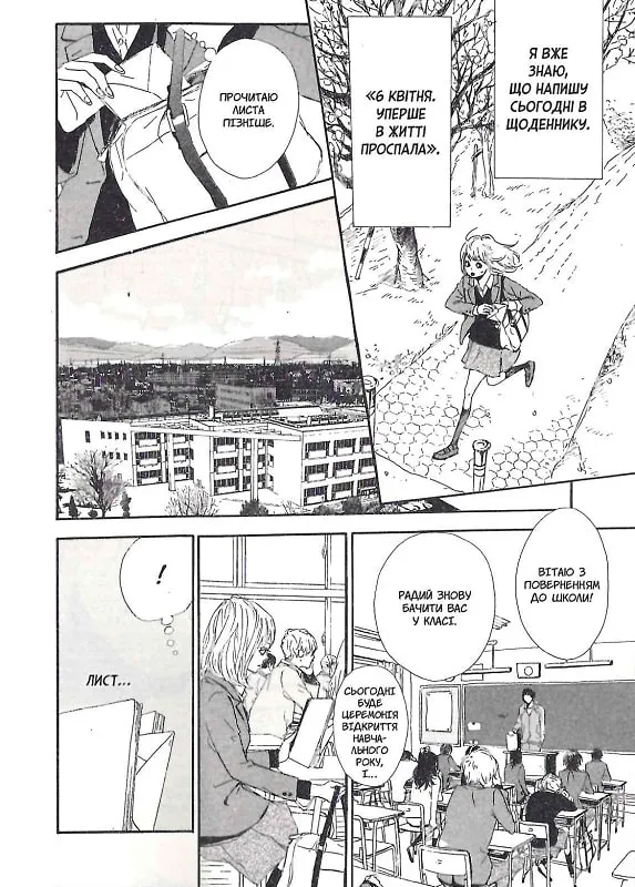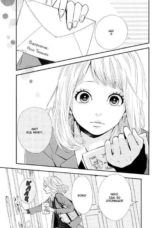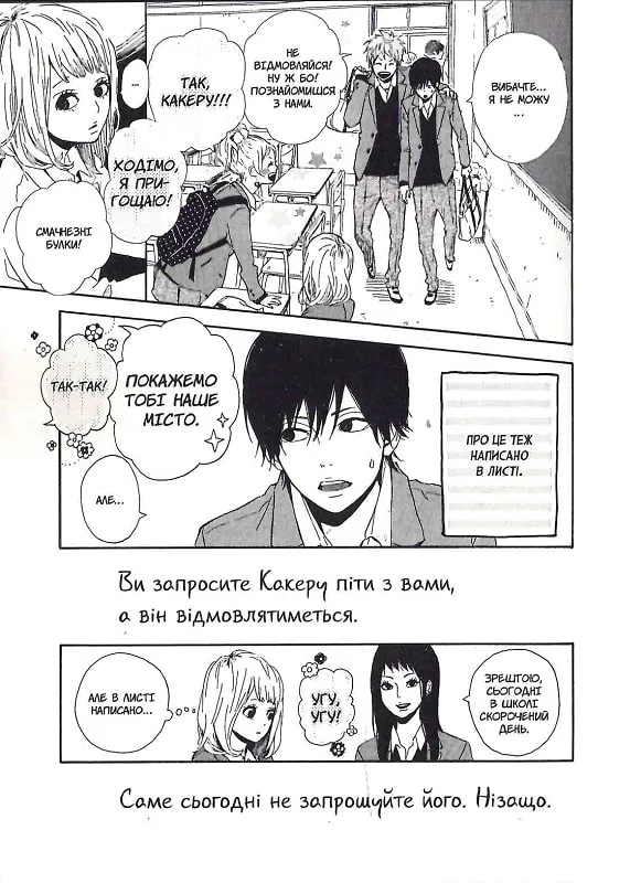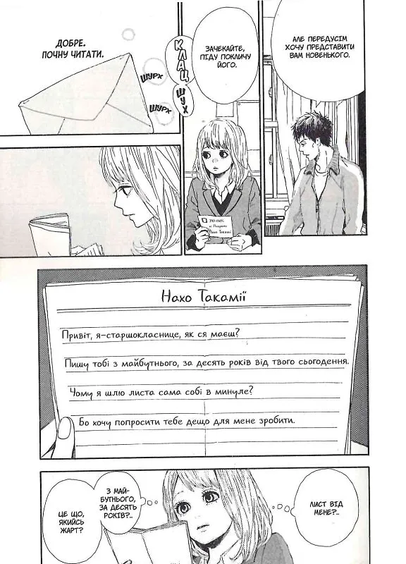 Того ранку все пішло шкереберть. Нахо проспала і поспіхом збиралася до школи, коли раптом побачила дивний конверт з листом, написаним її рукою. Ніби-то вона сама написала собі з майбутнього! Ніби-то старша на десять років дівчина вирішила вберегти молодшу себе від фатальних помилок. Але ж це неможливо!Як взагалі в таке повірити? Здається, Нахо з майбутнього і це передбачила, детально описуючи, що відбудеться далі, і як слід діяти, щоб потім не було надто пізно. Лист ніби й переконливий, але й надто фантастичний.Тим паче, дещо з цього сором'язлива Нахо ніколи б не зробила. І її старша версія мала б про це знати. Однак, дівчина не сумнівається, що новенький у класі, якого звати Какеру, відіграє у її майбутньому особливу роль.