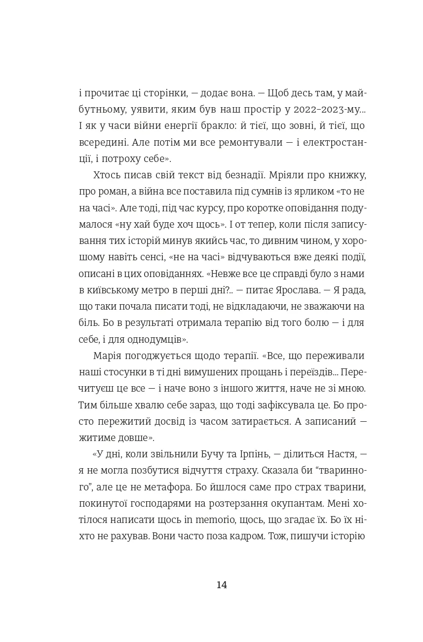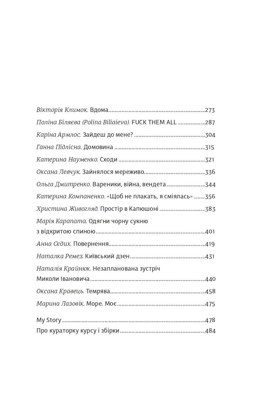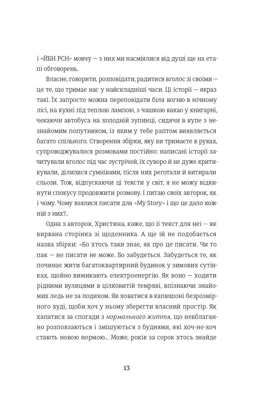 Перед вами - збірка короткої прози, написаної авторками-учасницями курсу письма Ірени Карпи «My Story». Це історії проживання російсько-української війни, які, художньо переосмислені та втілені в оповідання й есеї, звучать розмаїто, але є голосами одного спільного досвіду.«Не знаю, як про це писати»... Про те, яким був мій день 24.02. Про те, чому поїхала або чому лишилася. Про те, як мене розривало від болю, хоча давно мешкаю за кордоном. Про те, як пристосовувалася до умов війни, залишаючись в Україні. Про те, кого зустріла на своєму шляху і які дізналася історії про інших жінок, чоловіків, дітей, тварин. Про те, як руйнувався мій світ і як я збирала його заново. Про те, як переживала загибелі дорогих людей і як шукала спосіб бути корисною. Про те, як ненавиджу й палаю від люті.Про те, як сильно люблю. Про те, від чого плачу і над чим сміюся, проходячи власний досвід цієї війни.