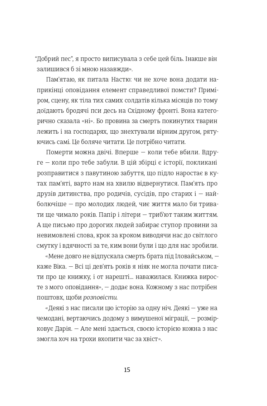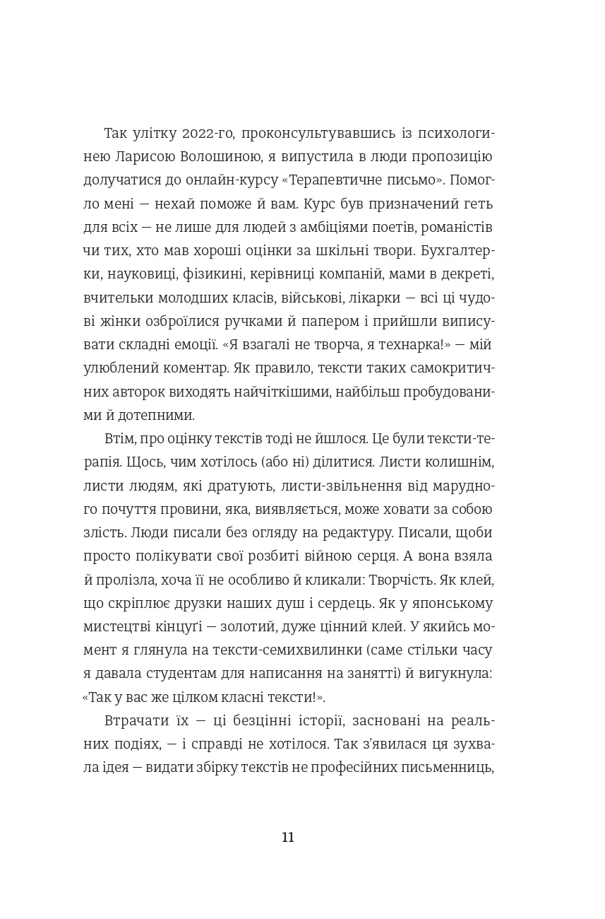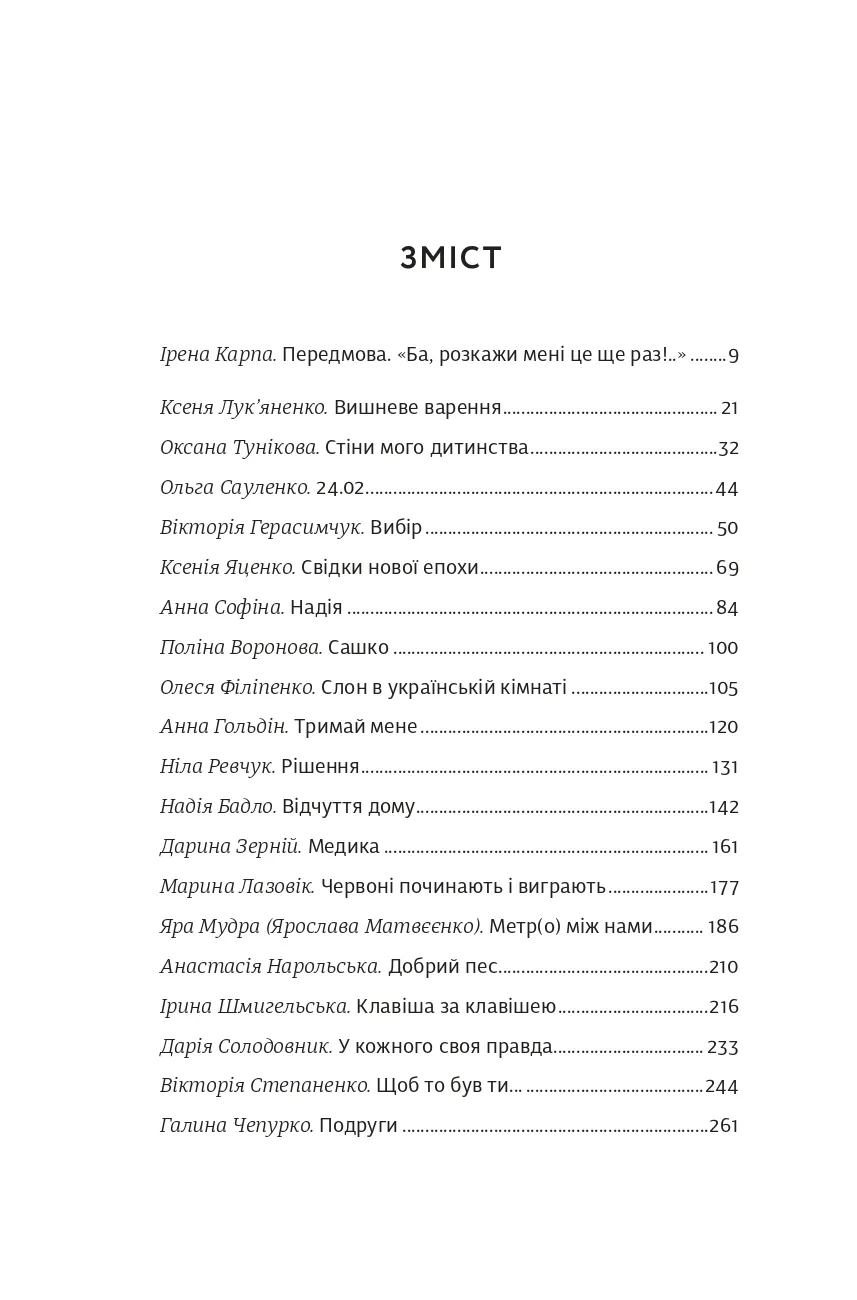 Перед вами - збірка короткої прози, написаної авторками-учасницями курсу письма Ірени Карпи «My Story». Це історії проживання російсько-української війни, які, художньо переосмислені та втілені в оповідання й есеї, звучать розмаїто, але є голосами одного спільного досвіду.«Не знаю, як про це писати»... Про те, яким був мій день 24.02. Про те, чому поїхала або чому лишилася. Про те, як мене розривало від болю, хоча давно мешкаю за кордоном. Про те, як пристосовувалася до умов війни, залишаючись в Україні. Про те, кого зустріла на своєму шляху і які дізналася історії про інших жінок, чоловіків, дітей, тварин. Про те, як руйнувався мій світ і як я збирала його заново. Про те, як переживала загибелі дорогих людей і як шукала спосіб бути корисною. Про те, як ненавиджу й палаю від люті.Про те, як сильно люблю. Про те, від чого плачу і над чим сміюся, проходячи власний досвід цієї війни.