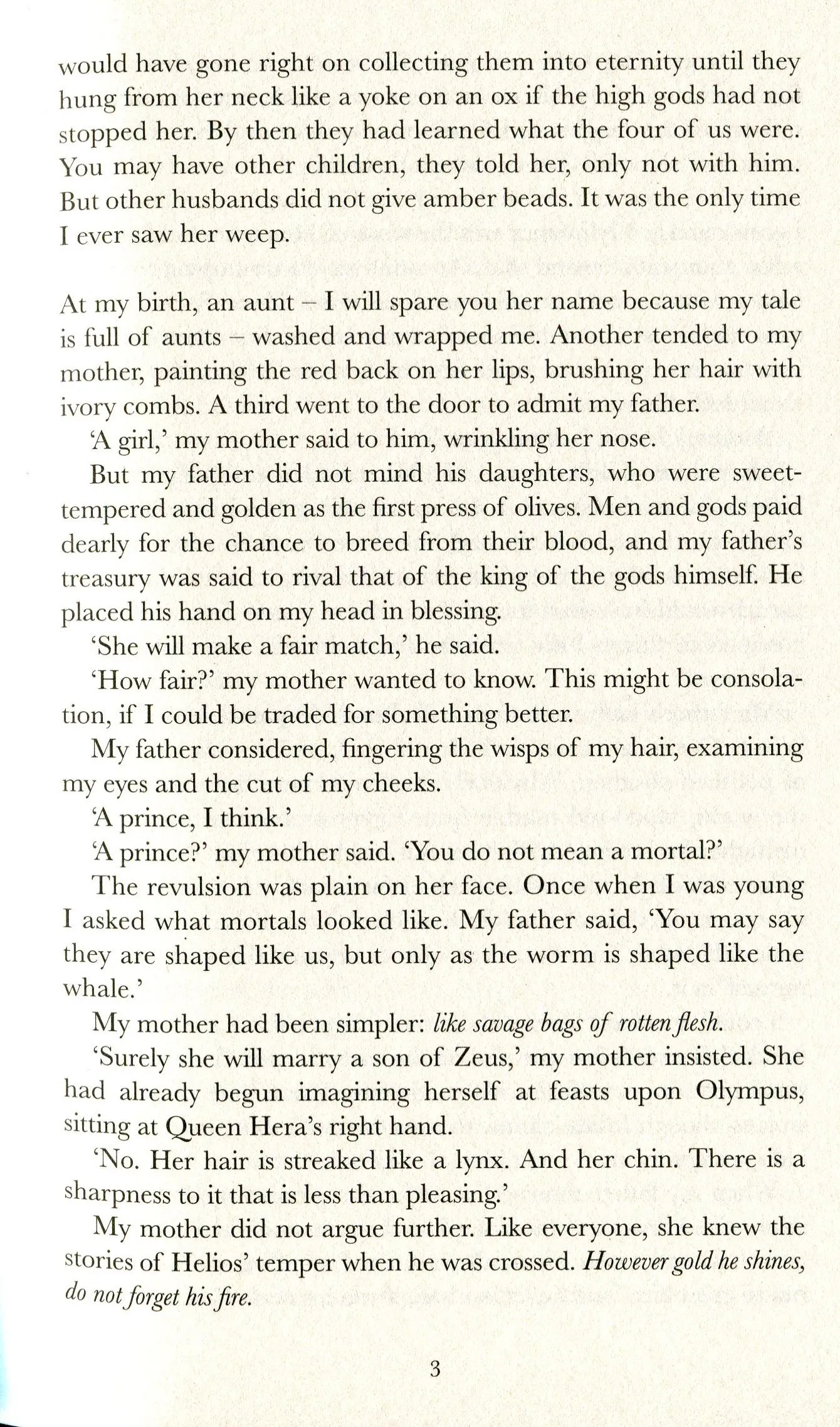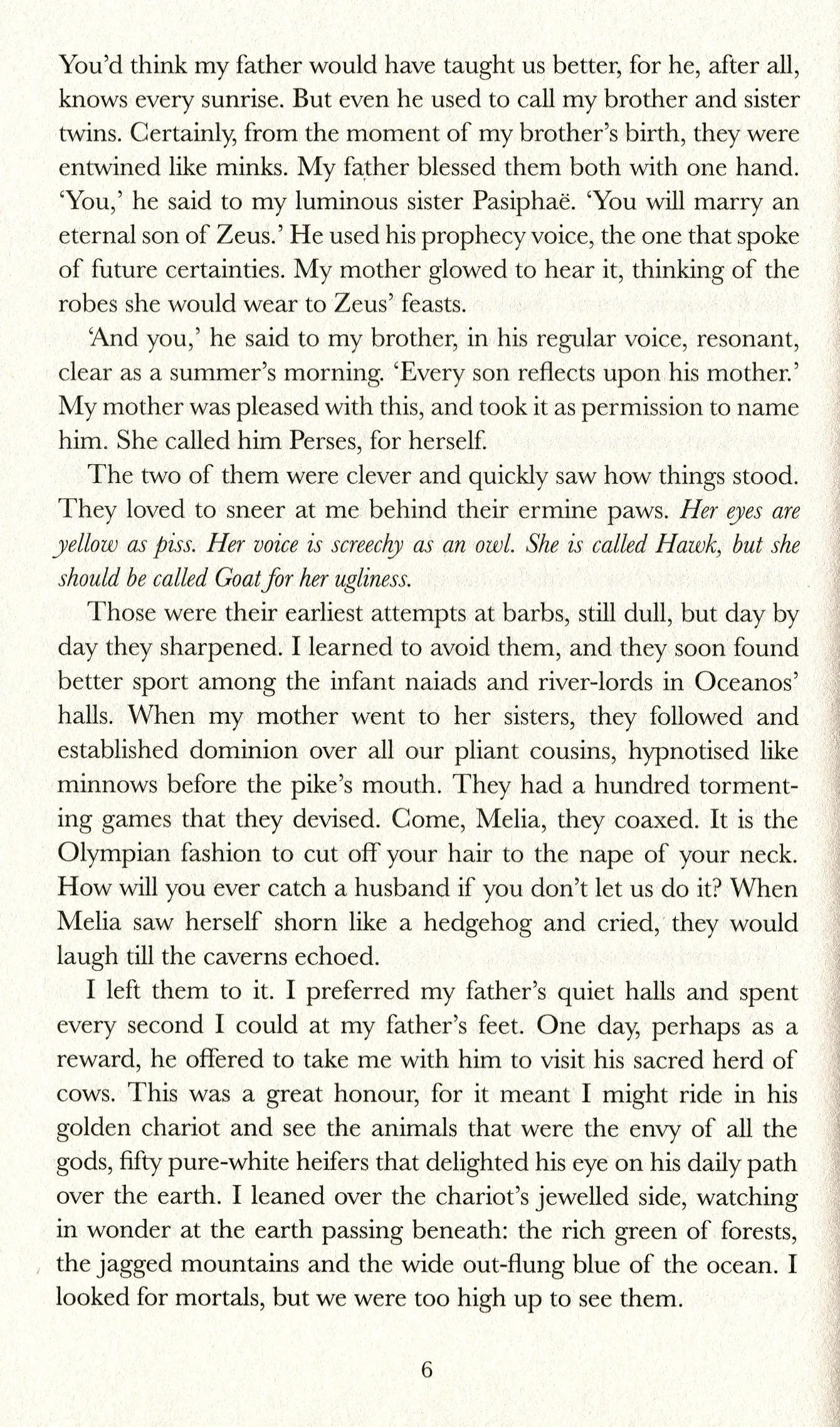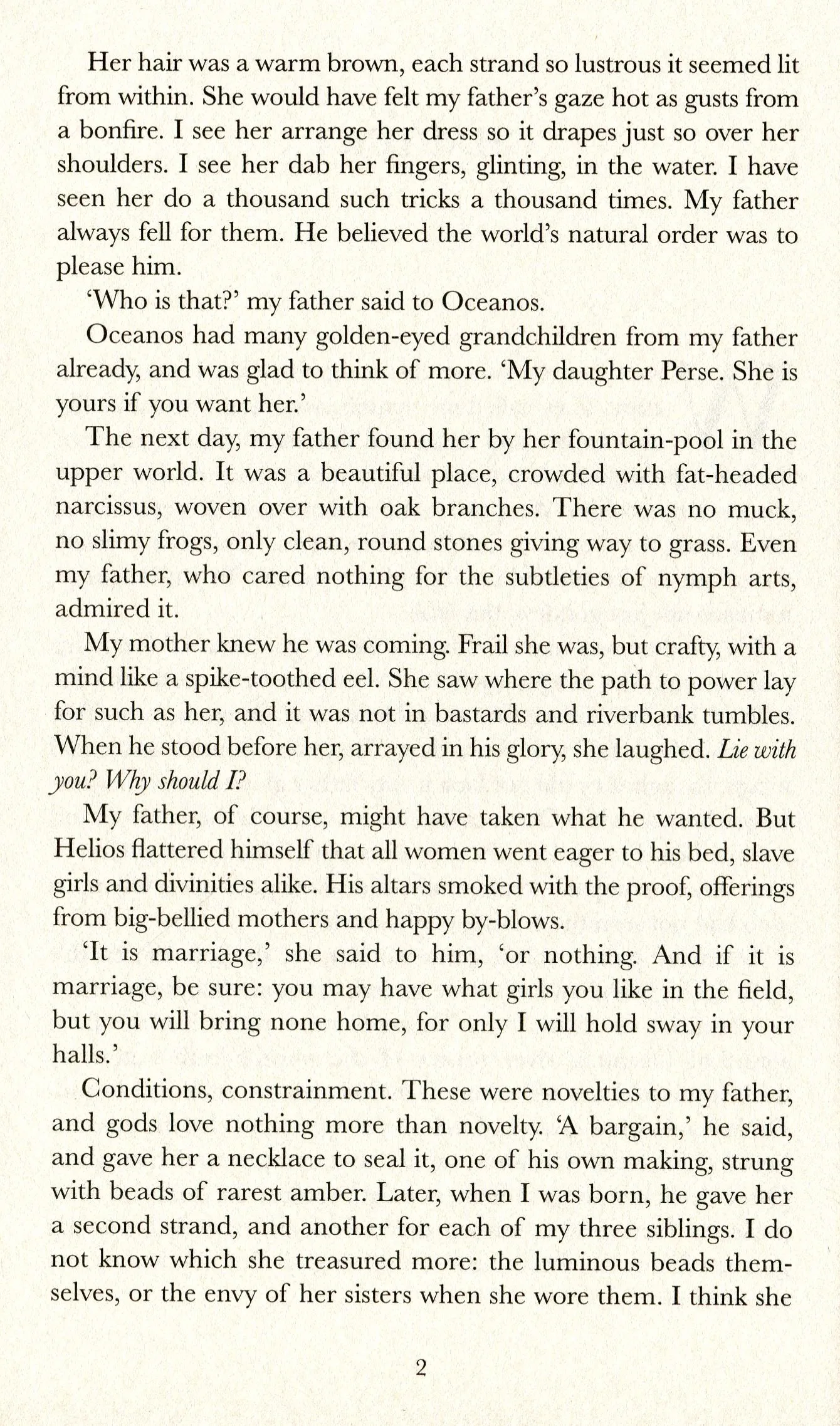 Так Цирцея починає свою розповідь - яскраву, захоплюючу епопею родинного суперництва, кохання і втрати - зухвалу, невгасиму пісню жінки, що палає гарячим і яскравим світлом крізь темряву чоловічого світу.