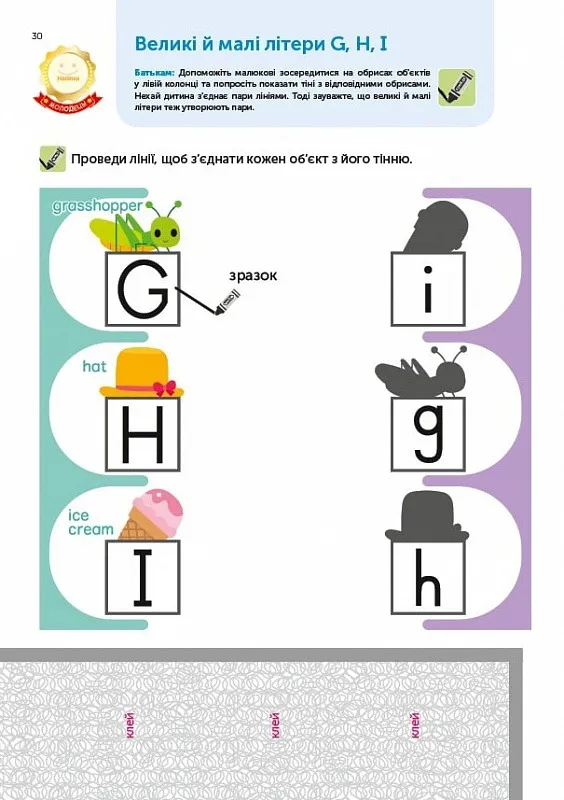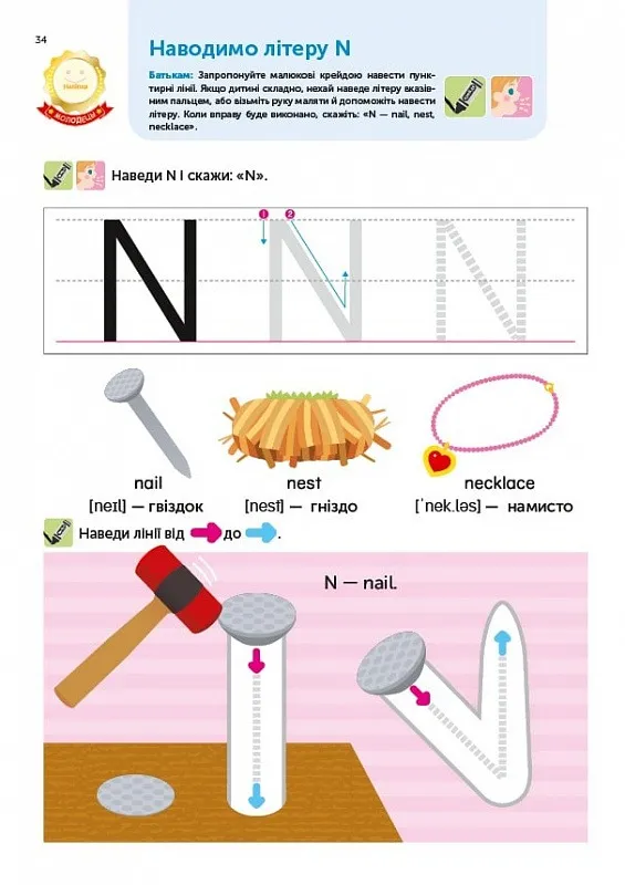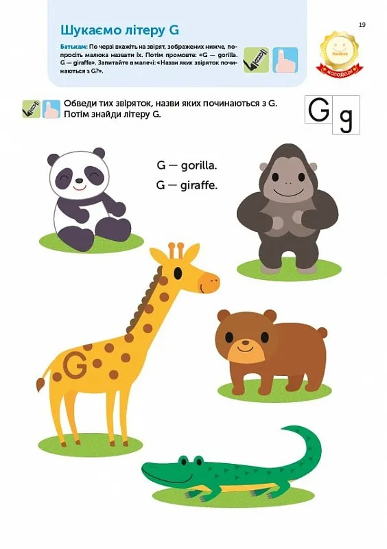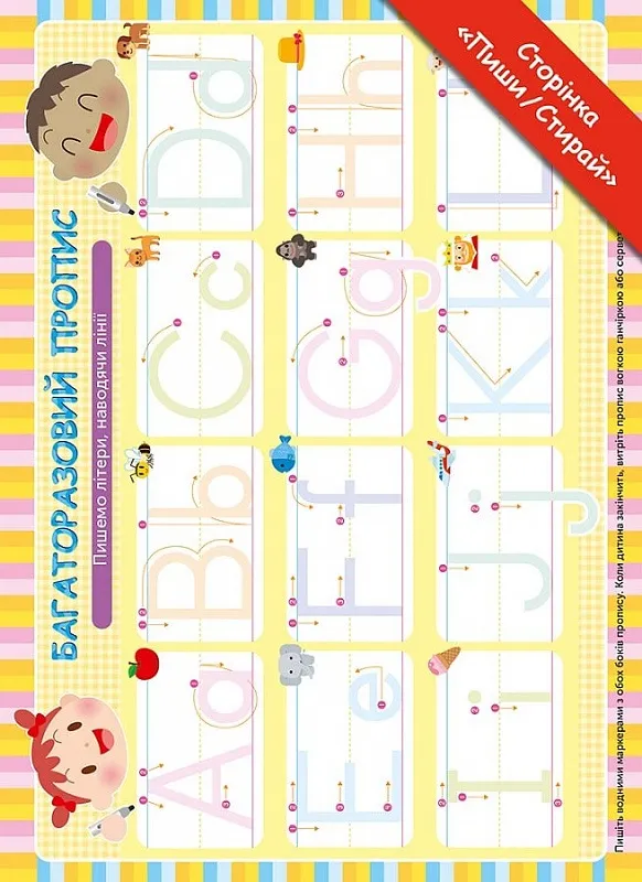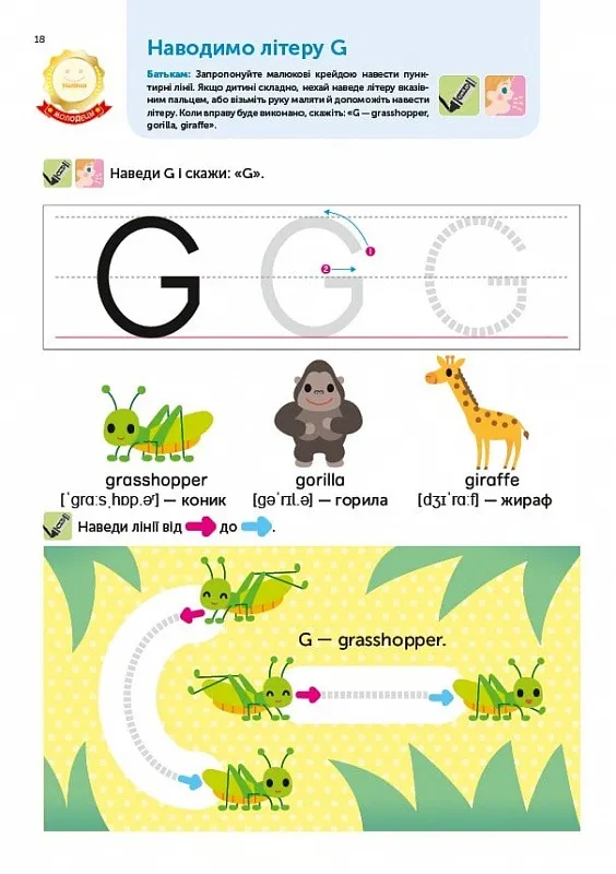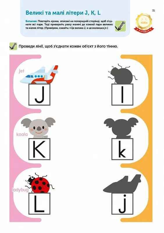 Унікальна японська методика у вигляді гри закладе міцний фундамент для опанування іноземної мови у дошкільному віці. Цікаві завдання поступово ускладнюються, щоб дати дитині відчуття поступу. Веселі вправи готують до перших кроків у читанні, вчать розпізнавати великі та малі літери, дитина практикується їх відрізняти і співвідносити.