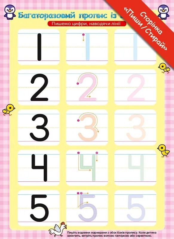 Захопливі вправи в ігровій формі готують до перших кроків у математиці, розвивають дрібну моторику, вчать розпізнавати і писати цифри від 1 до 5 та знайомлять малюка з числами першого десятка.