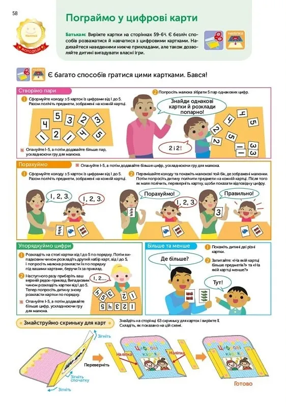 Зіставляючи пораховані предмети та шукаючи відповідності, ваша дитина знайомитиметься з числами від одного до десяти. Втім, основна увага надаватиметься розпізнаванню цифр від одного до п’яти.