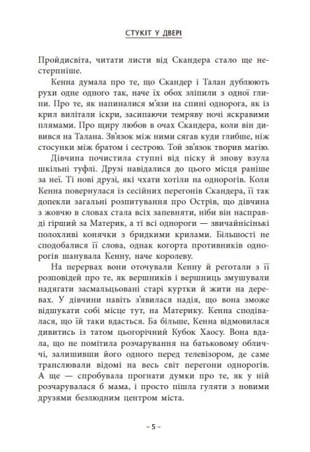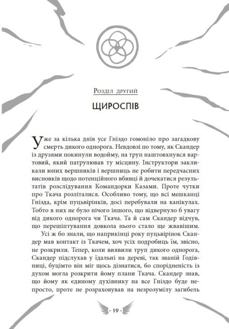 Скандер з друзями розуміють, що ці убивства — частина якогось злостивого задуму. Здається, що сам Острів мститься за нищення безсмертних руйнівними стихійними лихами. Чи до снаги квартету малечі зупинити смерті? Чи вдасться врятувати Острів? А ще б не вилетіти з другого курсу й залишитися в Гнізді на наступний рік!Дивно, що бодай хтось стає на бік Скандера, якщо, звісно, найславетнішу родину сідлярів чи Спільноту Сапсана, найкрутіше з товариств Гнізда, можна вважати «кимось». Попереду навчання й тренування, які мають завершитися лицарським турніром малечі, за результатами якого шістьох найслабших виженуть з Гнізда. А диких продовжують убивати…ГЕРОЇ ТА ОДНОРОГИ, ЯКИХ ВИ НІКОЛИ РАНІШЕ НЕ БАЧИЛИ По гриві й хвосту чорного звіра прокотилися електричні розряди… Здавалося, ніби вершник осідлав блискавицю, бо сам одноріг перетворився на стихію! Талан Пройдисвіта іржав у тріумфі, й у вирі електричних розрядів годі було розгледіти щелепи однорога! ЕПІЧНА ПРИГОДА ТРИВАЄ...