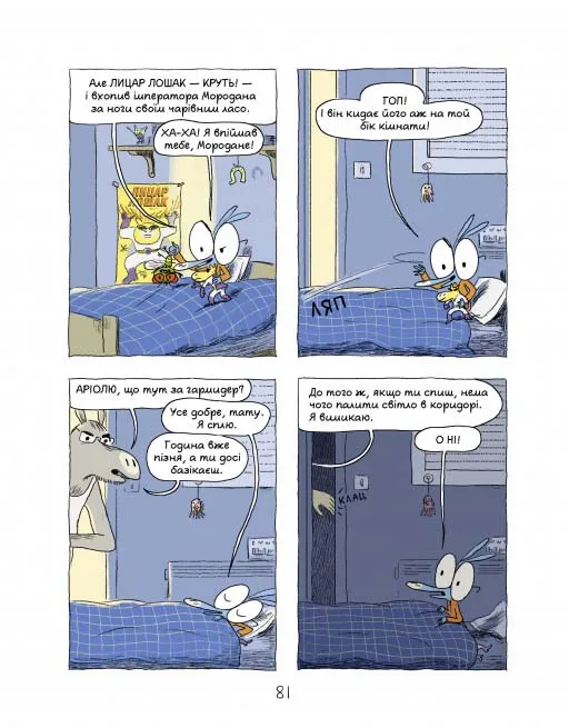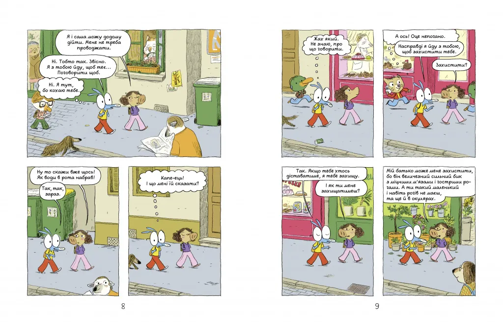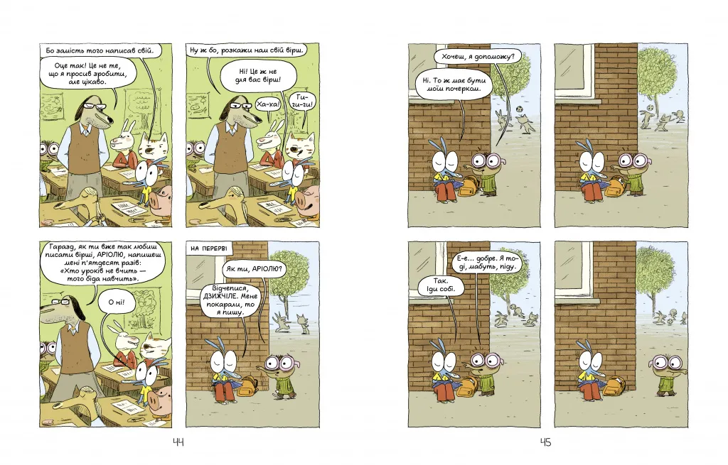 Все просто: Аріоль — маленький віслючок, а Рамоно — підсвинок. Аріоль — блакитного кольору, має довгі вуха й носить величезні окуляри. Рамоно — рожевого кольору і має п’ятачок, схожий на велику електричну розетку. Вони не надто подібні, однак товаришують. Та що там! Вони настільки близькі друзі, що інколи порося впирається, мов той осел, а віслючок поводиться, мов справжній свинтус. Ось тоді вже важко сказати, хто є хто!