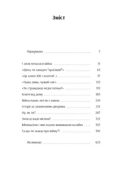 В основі книги — розмови із жінками про виклики, досвіди, емоції, з якими їх зіштовхнула повномасштабна війна. Охоплює теми: краса на війні, знецінення власних страждань і власного досвіду, домашній аб’юз, облаштування життя в евакуації, облаштування життя — власного та дітей — за кордоном, на новому місці, в статусі ВПО чи біженки, втрата дому, поколіннєве ретравмування (історії вірменок, чиї предки тікали від геноциду в Туреччині сто років тому, а потім тікали від війни в Карабасі, і тепер — з Донбасу — це в межах родової історії однієї родини), досвід виживання в окупації і виїзду на безпечні території, про творчість, яка рятує на війні, про бізнес, заснований жінками під час війни, про нову емоційну зрілість, місячні та жіноче здоров’я на війні та розмови про те, яким буде життя після війни.