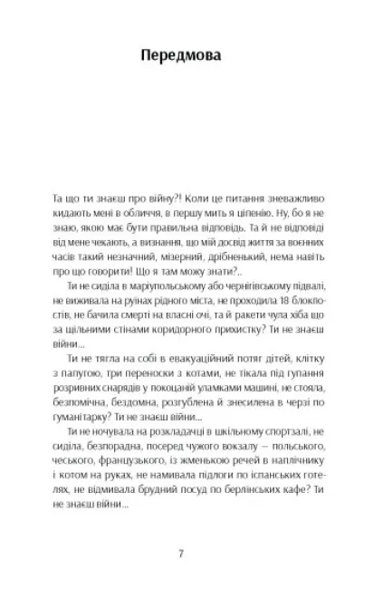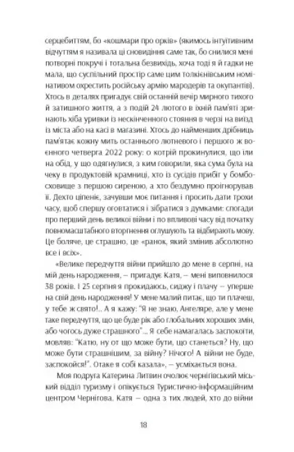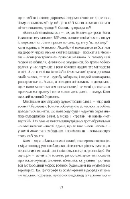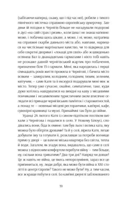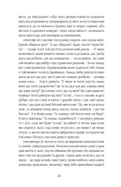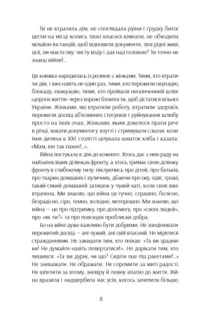 Книжка художніх репортажів про важливість і цінність жіночого досвіду проживання війни — в окупації, в евакуації, у статусі біженки, у статусі ВПО, у тилових містах, у прифронтових містах, жінок молодих, жінок старших, з дітьми, з дітьми з інвалідністю, без дітей, з тваринами, із старенькими рідними — і подолання знецінення внеску жінок, які не були на передовій чи у війську, в перемогу.