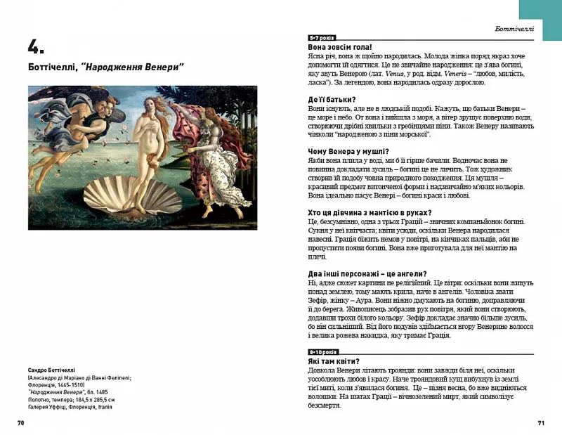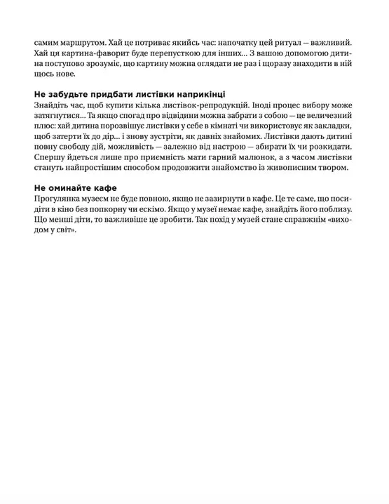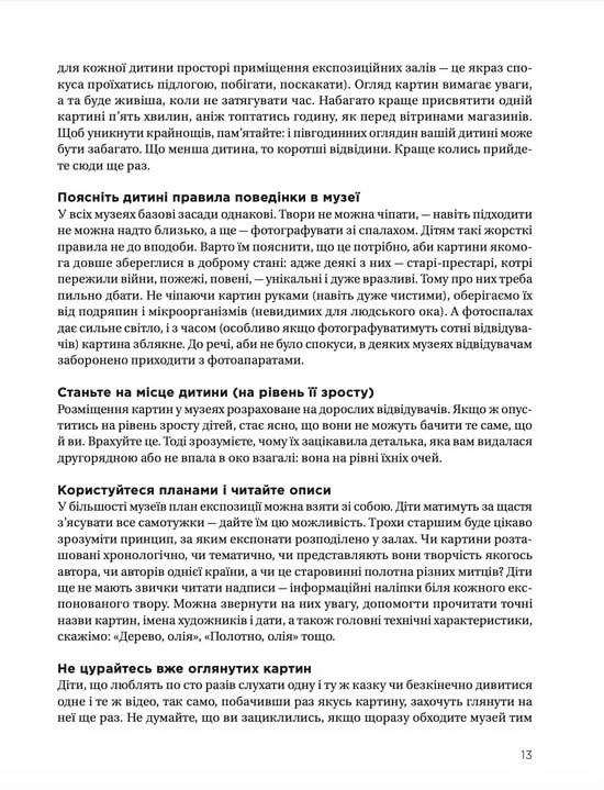 Простими словами і в зручній формі авторка підказує, як навчити дітей «бачити» картину, розуміти її і відчувати. На найпоширені й найактуальніші питання запропоновано лаконічні відповіді, покликані задовольнити цікавість і заохотити до нових пошуків. Це конспект, путівник, довідник і мистецький альбом водночас, який можна ретельно вивчати вдома, нашвидкуруч гортати у транспорті чи розглядати в парку.Книгу адресовано не лише натхненним батькам і педагогам, які прагнуть змалку зацікавити дітей світом мистецтва, – вона й для тих допитливих читачів і читачок, які ніяк не знаходили часу його пізнати.