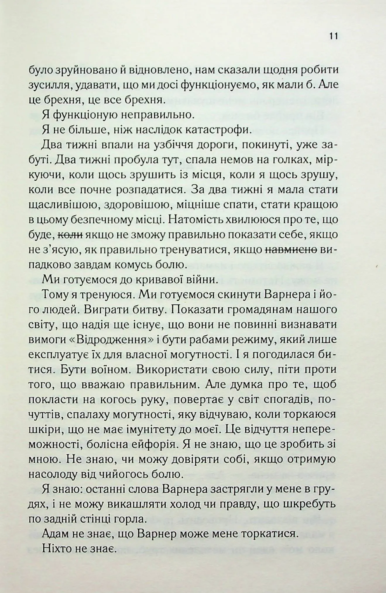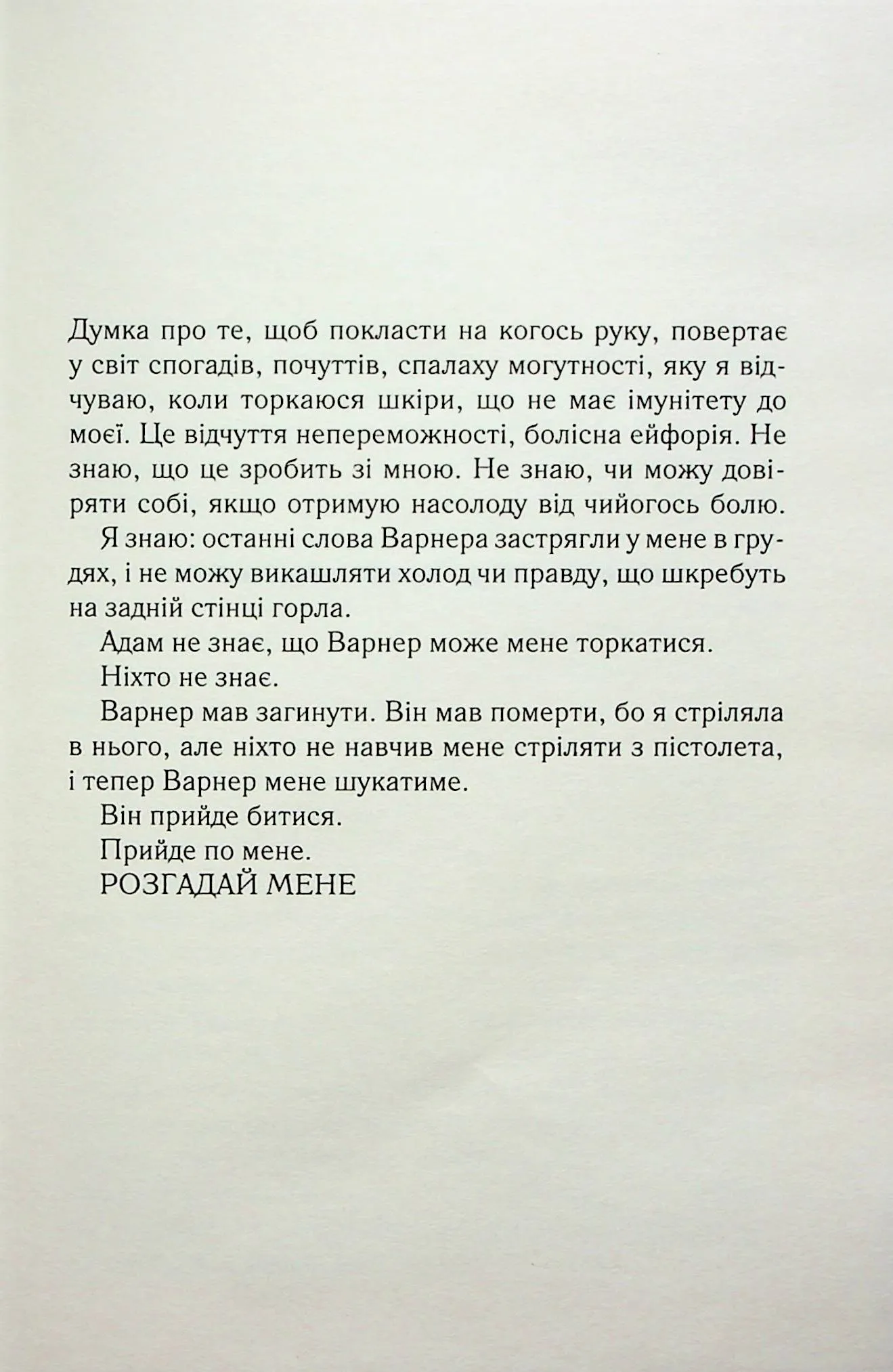 Наші губи торкаються, і я знаю, що тріщу по швах. Він цілує мене, немов він втратив мене, знайшов, і я вислизаю, проте він ніколи мене не відпустить.Джульєтта мусила скористатися смертельним даром і вбити одним дотиком того, хто становить для неї найбільшу загрозу. Проте це виявилось неможливим. Невразливість Варнера до її сили похитнула впевненість дівчини, проте вони з Адамом зуміли не лише втекти, а і знайти союзників у боротьбі проти «Відродження». Джульєтта сподівається, що тепер їй вдасться розкрити секрет своїх таємничих властивостей.