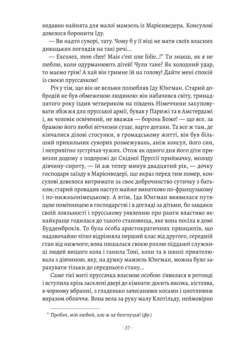 Легендарна сага, удостоєна Нобелівської премії з літератури, майстерний і філігранно виписаний портрет сім’ї на фоні історичної епохи. Ця фамілія мала втілювати німецькі чесноти, однак вони народилися Будденброками — життя заборгувало їм від початку. Кохання і зради, боротьба і заздрощі, несамовита пристрасть і пекуча ненависть трьох поколінь клану — від владного патріарха Йоганна Будденброка до його онуків, не здатних втриматися від спокуси забороненого плоду, який їм пропонує світ.