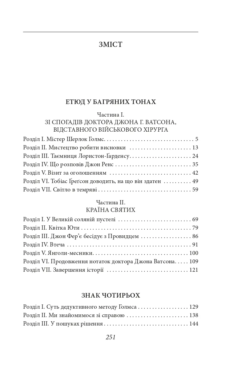 Повість «Етюд у багряних тонах» (1887) відкриває цикл творів про знаменитого сищика Шерлока Голмса та його компаньйона доктора Ватсона — це жаліслива історія кохання і помсти, що заверши-лася кількома вбивствами у Лондоні.