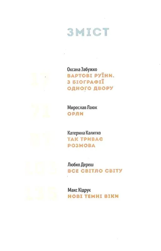 П’ять цілковито різних історій, як за настроєм, так і за жанровим наповненням, розмістилися під обкладинкою. Тут герої проводять свої життя, осмислюючи помилки, будуючи плани на майбутнє, простежуючи невблаганний зв’язок між дрібницями особистого і великими наслідками суспільного. Через усі історії прозирає спільний герой — місто Луцьк — десь натяком, десь прямою згадкою. Місто огортає своїм теплом усіх персонажів, та радо запрошує до себе читачів.