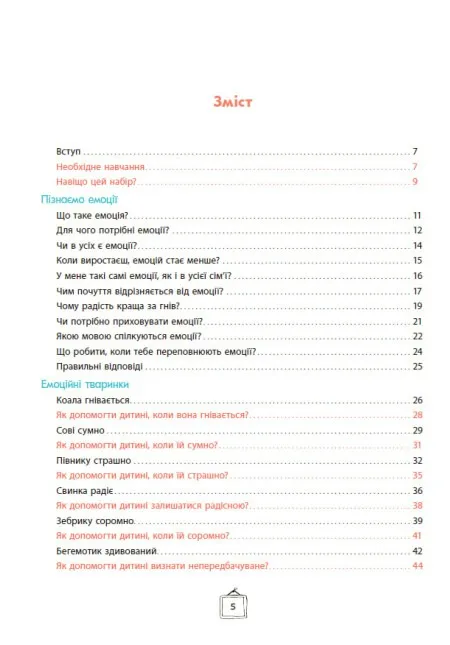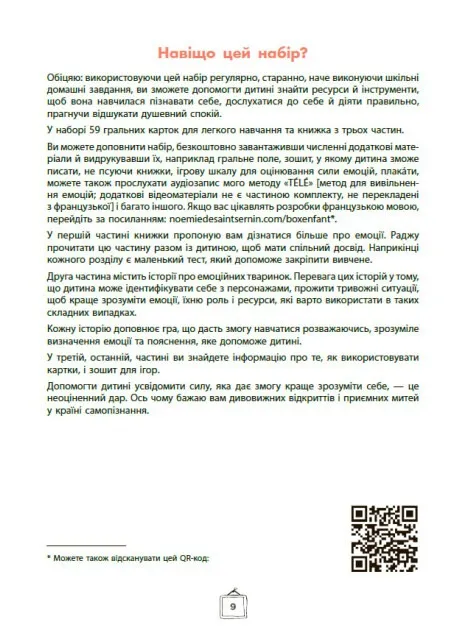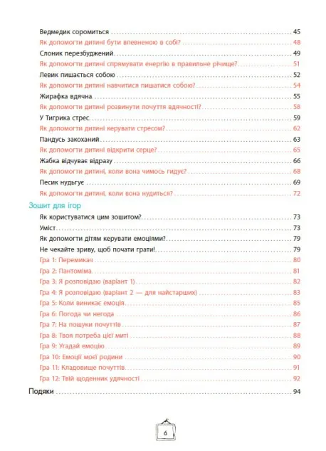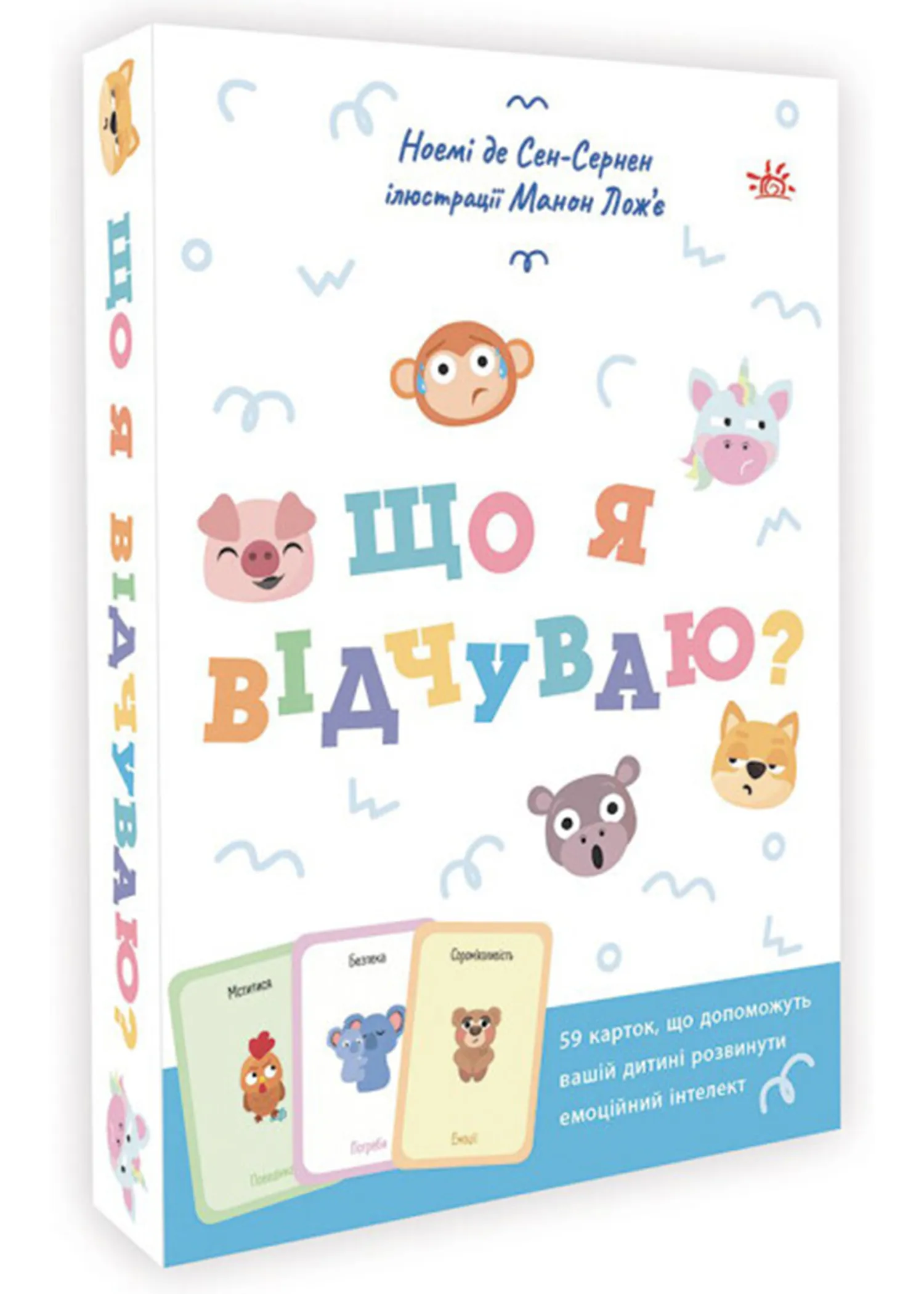 Дотепний і практичний спосіб опанувати бурхливі емоції маляти за допомогою коротких яскравих історій та ігор з картками. Зебрик, коала, свинка, півник та інші персонажі допоможуть дитині осягнути свої емоції, навчитися ділитися ними, а отже розрядити їх до того, як вони вибухнуть і захлеснуть дитину. Ноемі де Сен-Сернен, популярна авторка й фахівець в галузі особистісного розвитку, пропонує комплект з 59 карток з тваринками й карти зі шкалою, до яких додається книжка з детальними інструкціями, як користуватися комплектом.