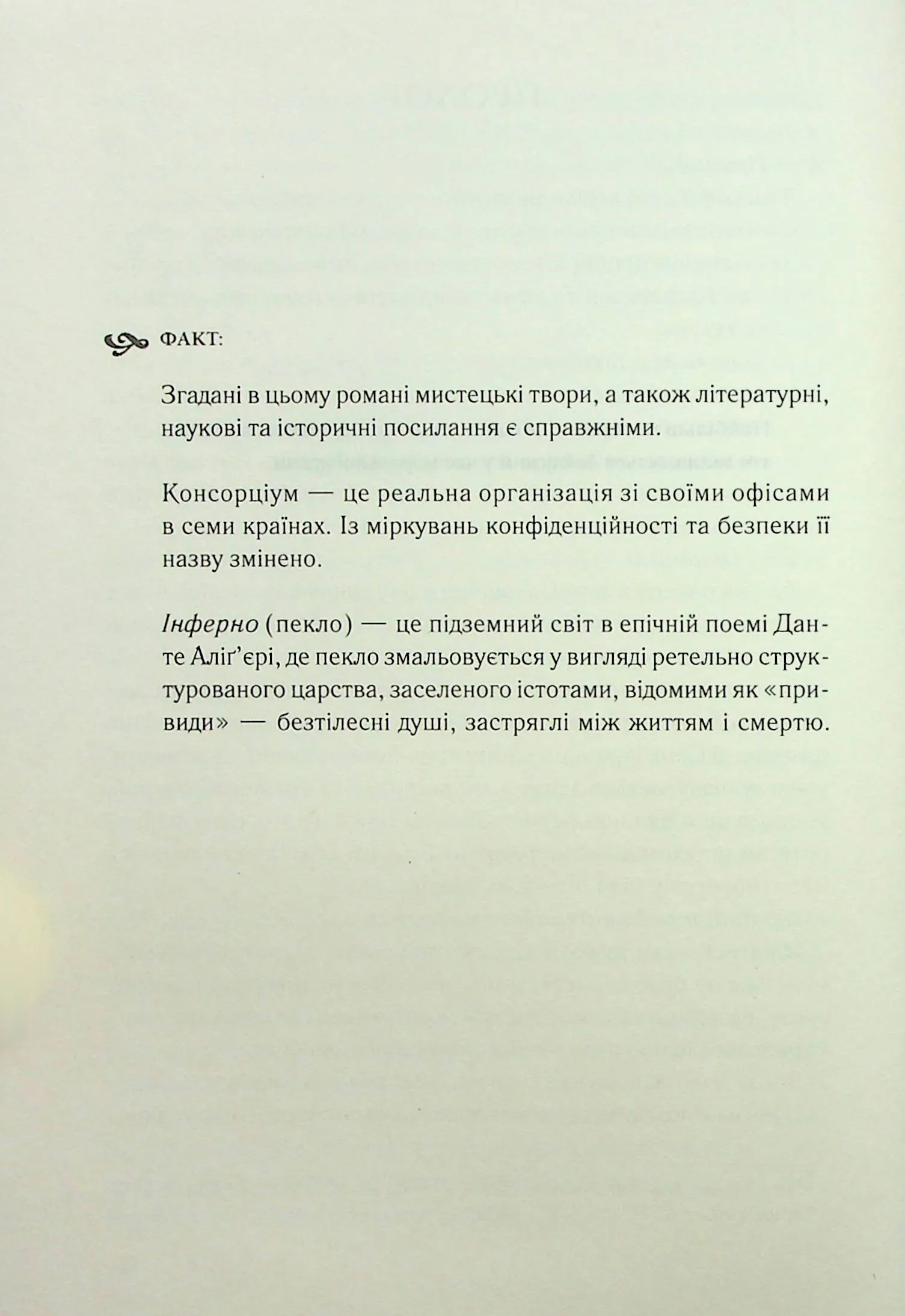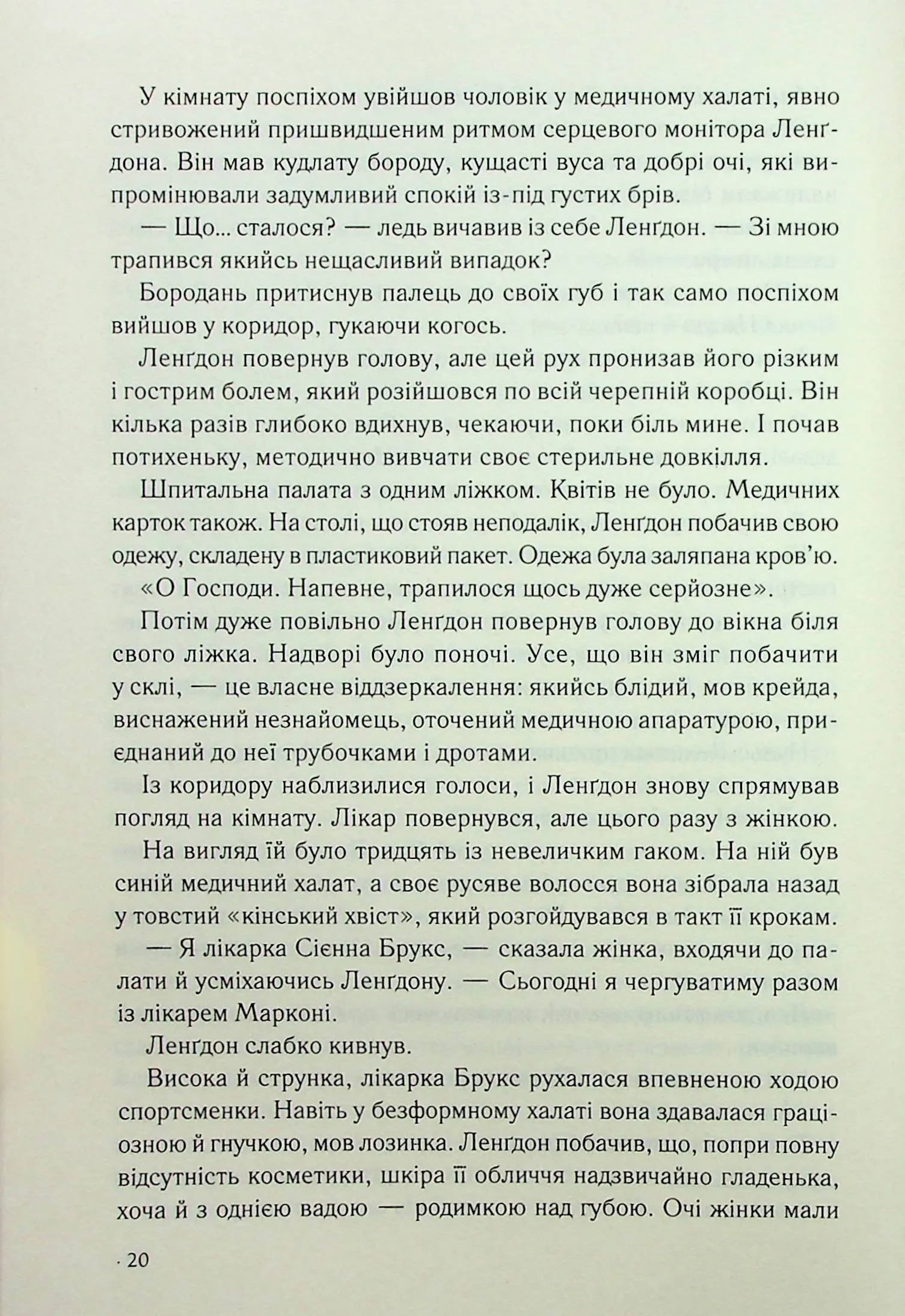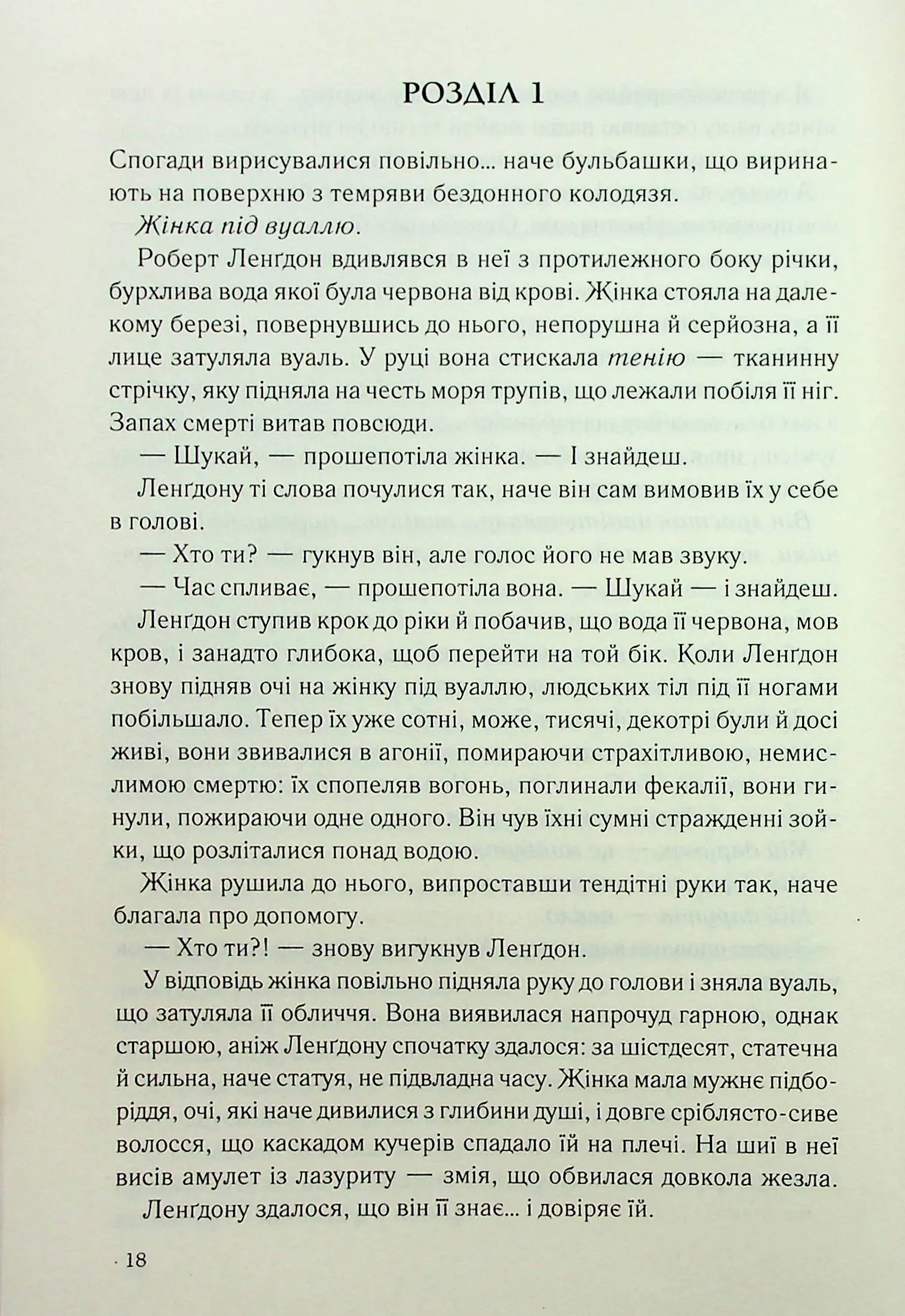 Запаморочливі пригоди, загадкові символи, небезпечні таємниці у кращих традиціях «Коду да Вінчі»!Професор Ленґдон прийшов до тями у лікарні у Флоренції. Як він опинився тут? Чому його хотіли вбити? І як він потрапив до італійського міста, сповненого стародавніх секретів? Роберт нічого не пам`ятає. Лише в моторошних видіннях він бачить жінку з дивним амулетом, яка благає про допомогу. А в кишені знаходить вказівку на картину Боттічеллі «Мапа пекла». Але картину дивно змінено...Зашифровані у витворах мистецтва послання, таємні тунелі і новітні технології — ось що чекає Ленґдона та його помічницю Сієнну на шляху до розкриття загадки божевільного генія. Та невідомий ворог випереджає їх на крок...