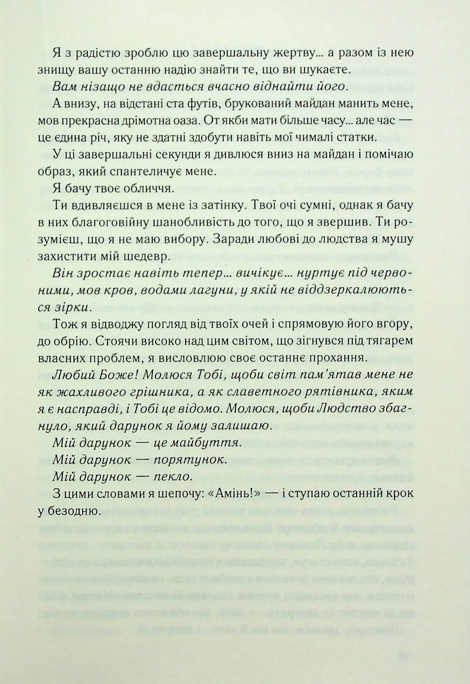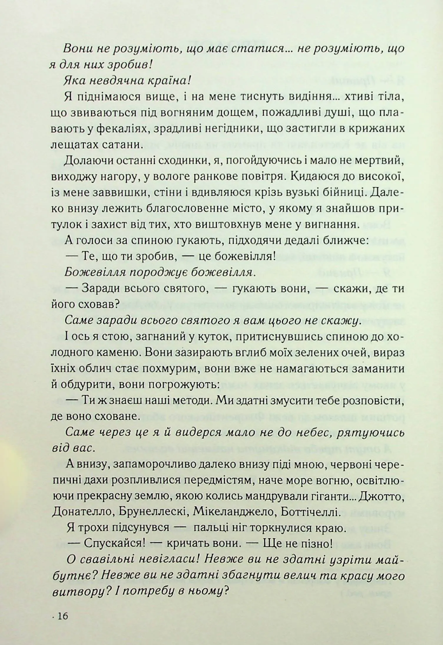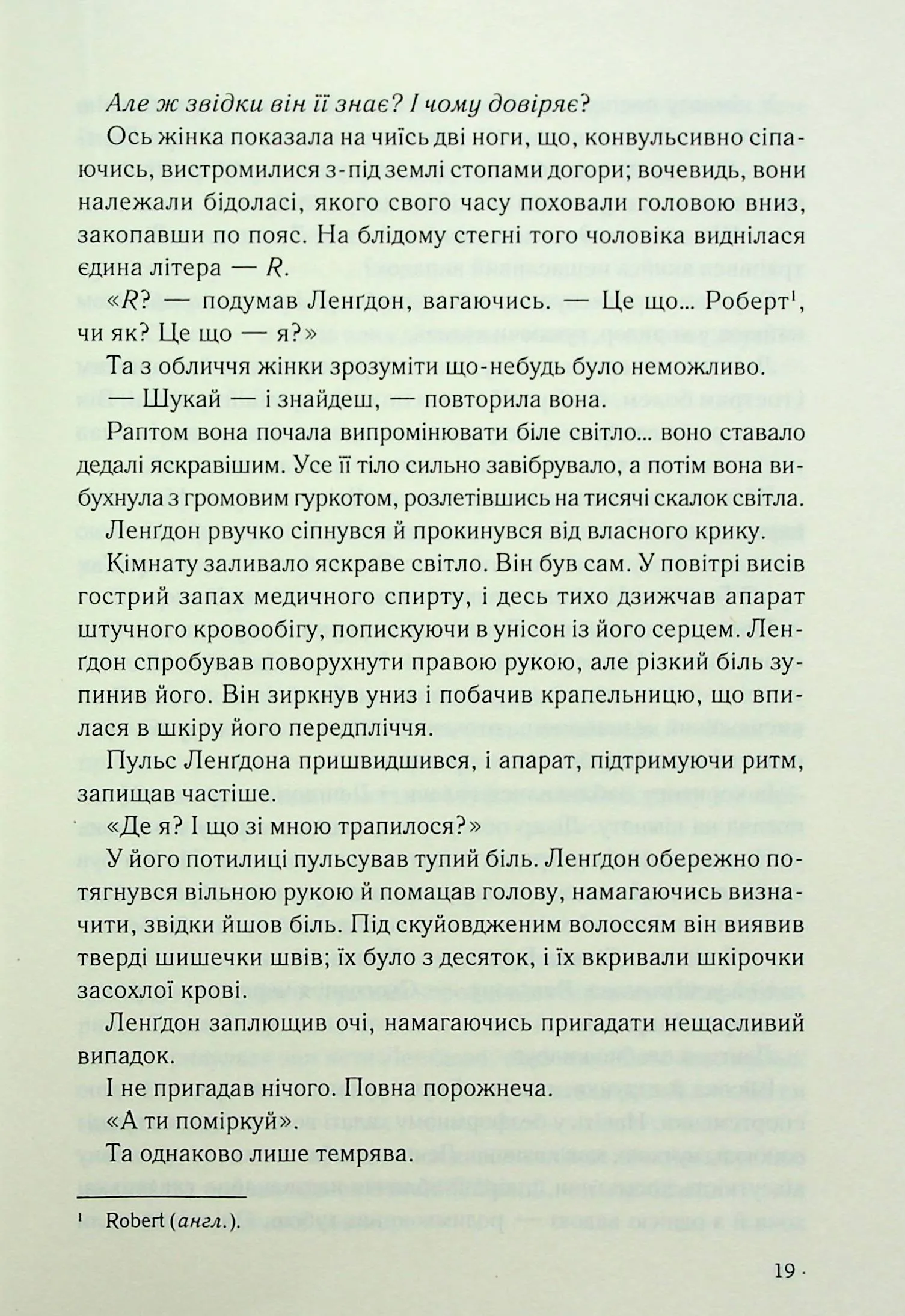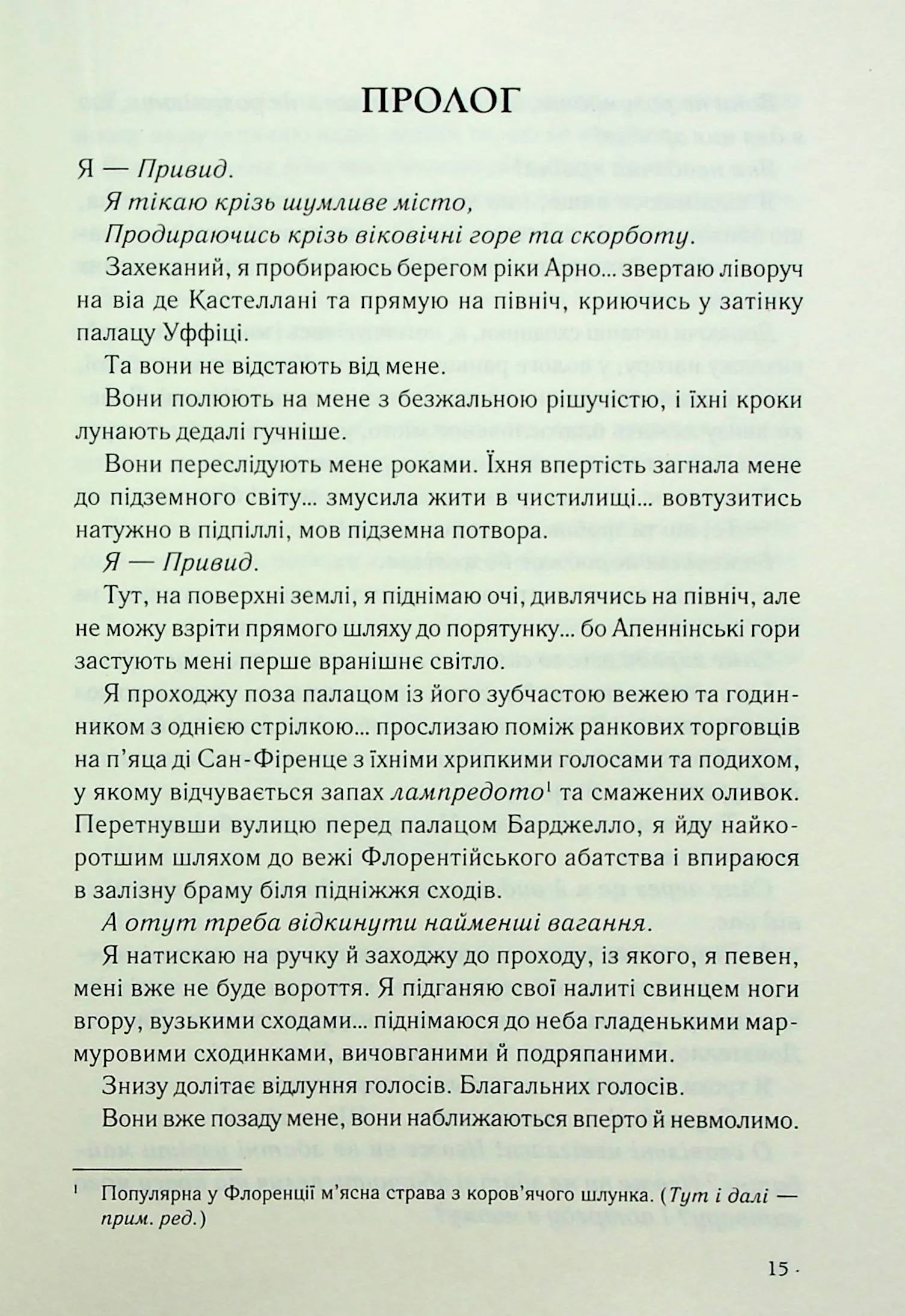 Запаморочливі пригоди, загадкові символи, небезпечні таємниці у кращих традиціях «Коду да Вінчі»!Професор Ленґдон прийшов до тями у лікарні у Флоренції. Як він опинився тут? Чому його хотіли вбити? І як він потрапив до італійського міста, сповненого стародавніх секретів? Роберт нічого не пам`ятає. Лише в моторошних видіннях він бачить жінку з дивним амулетом, яка благає про допомогу. А в кишені знаходить вказівку на картину Боттічеллі «Мапа пекла». Але картину дивно змінено...Зашифровані у витворах мистецтва послання, таємні тунелі і новітні технології — ось що чекає Ленґдона та його помічницю Сієнну на шляху до розкриття загадки божевільного генія. Та невідомий ворог випереджає їх на крок...