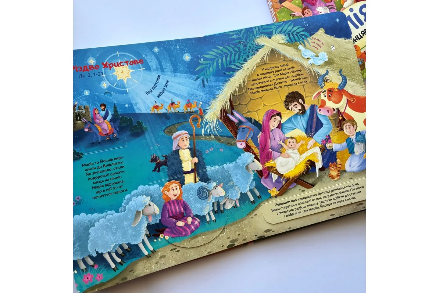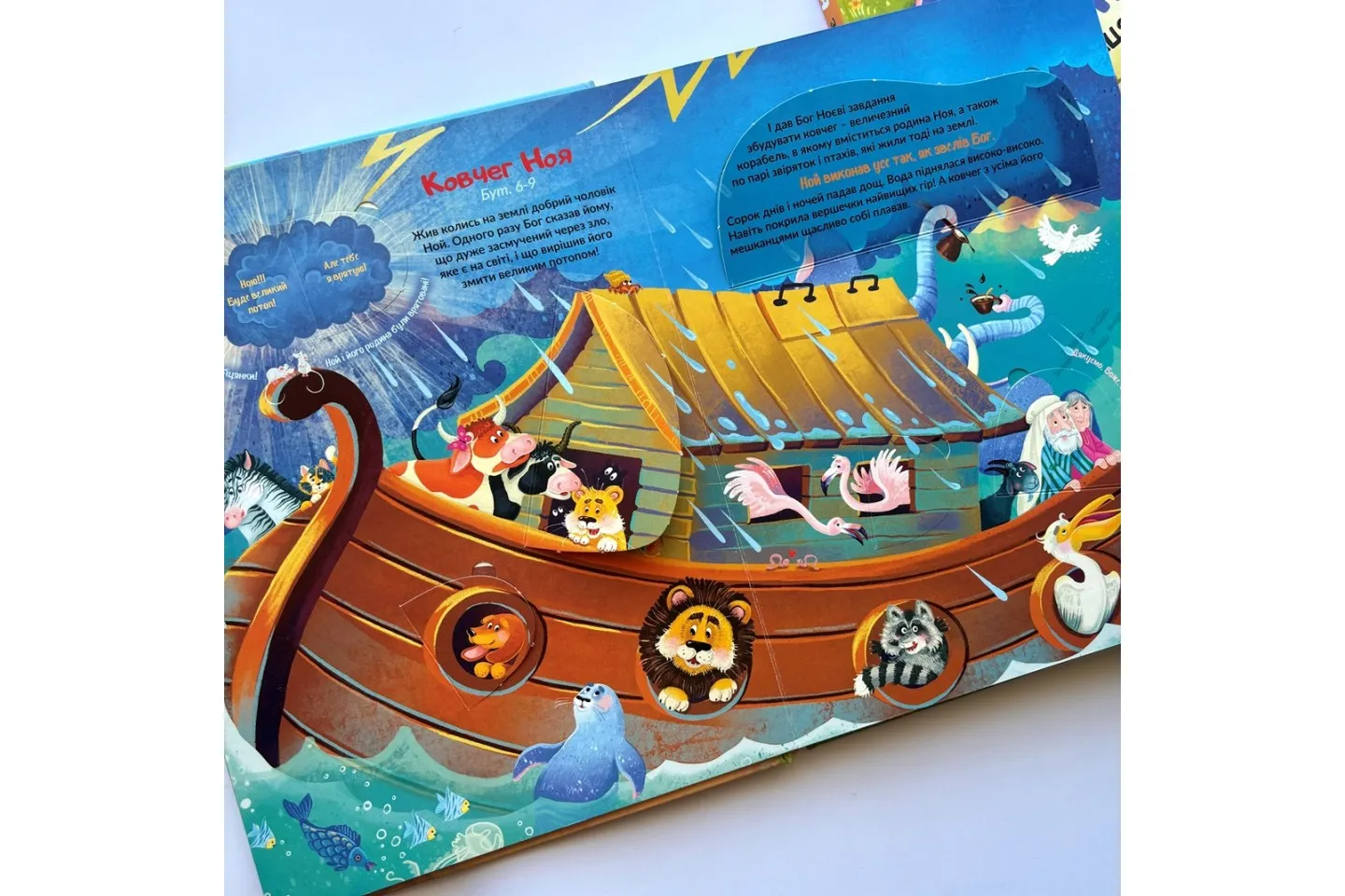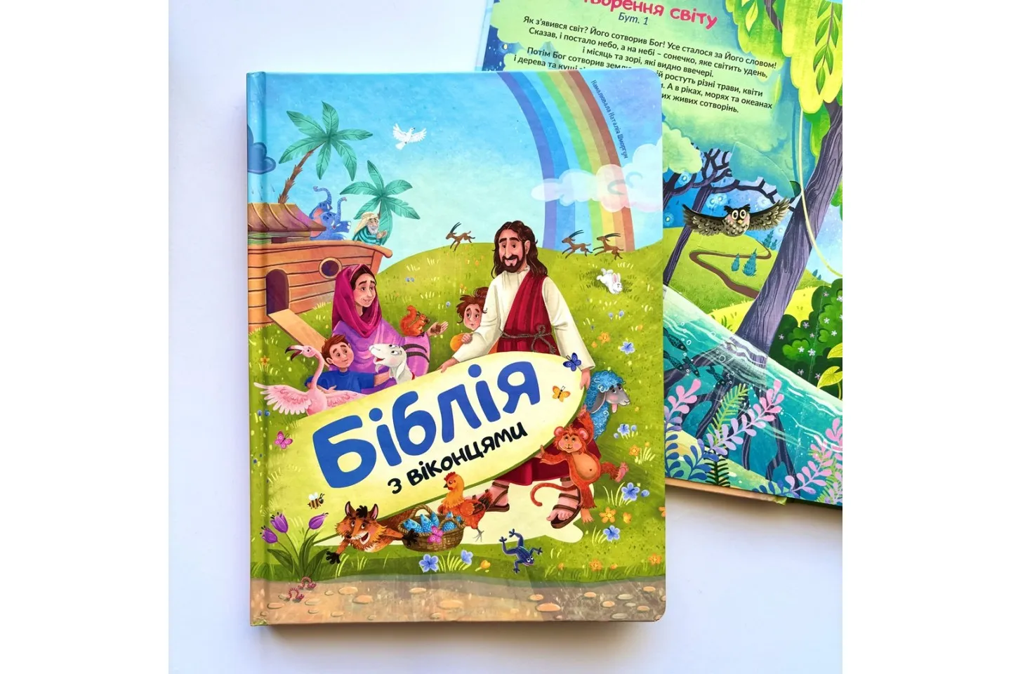 7 барвистих розгорток присвячено 8-м Біблійним темам: Сотворення, Ковчег Ноя, Давид і Голіаф, Різдво, Нагодування хлібом, Добрий самарянин, Розп'яття — Воскресіння. Чудові ілюстрації і стислі тексти закомпоновані у потайні віконця, відкриваючи які дитині буде цікаво і весело знайомитися з біблійними історіями.