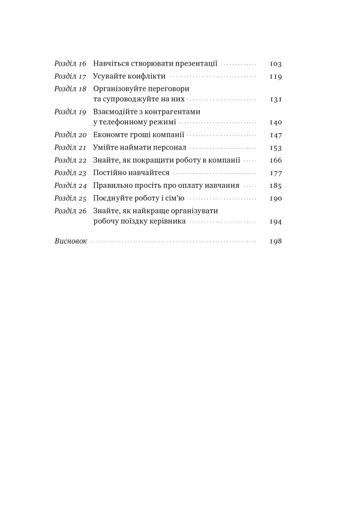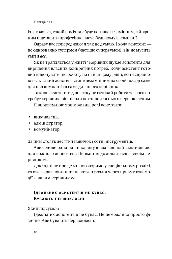 Ми віримо, що успіх компанії залежить від керівника. А що як на бізнес прямо впливає й менш очевидна кандидатура — асистент? Першокласний помічник звільняє керівника від мікроменеджменту, і той може зосередитися на стратегічних завданнях бізнесу, а також отримує більше часу на родину й хобі. Але як стати таким асистентом і за якими критеріями керівникові добирати собі помічника? Автор пропонує 26 розділів — практичних кроків, як розвинути якості першокласного асистента. Від чітких домовленостей і долання конфліктів до презентацій, організації відряджень та планування графіків роботи.