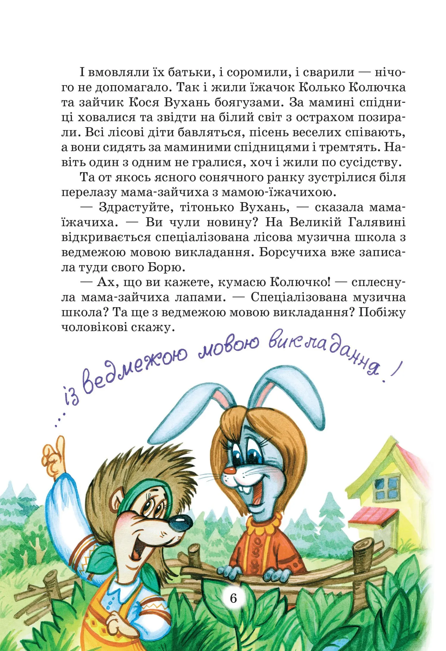 Легка, життєрадісна, сповнена доброго гумору книга розповідає про веселі, дотепні пригоди зайчика, їжачка та їхніх однокласників, учнів спеціалізованої музичної лісової школи з ведмежою мовою викладання.