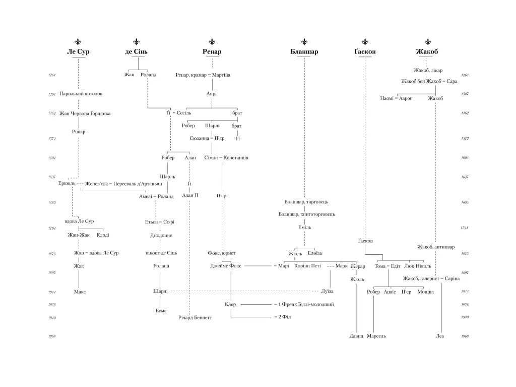 Карколомна історія кількох родин у багатьох поколіннях, долі яких переплелися в Парижі: аристократів, предками яких були лицарі Карла Великого; бунтівників, що роздмухували вогнище Французької революції; крамарів, які втратили нажите під час правління Людовіка XV і знову розбагатіли за Наполеона; простолюдинів із Монмартру, котрі будували Ейфелеву вежу та грабували багачів біля кабаре «Мулен Руж». Розповідь про любов, зраду, родинні таємниці, про людей, які творили Париж — центр світової культури.