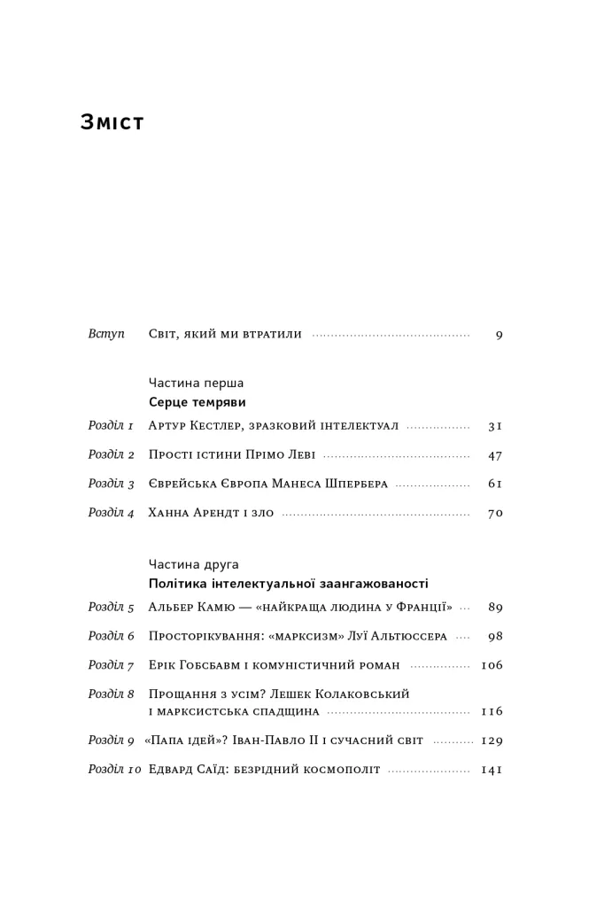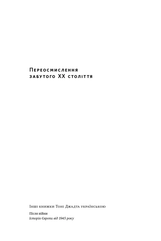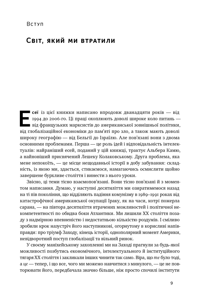 Саме його урокам, втратам, подіям і персоналіям присвячено цю книжку. У ній вміщено есеї, які історик та інтелектуал Тоні Джадт писав упродовж дванадцяти років. Ці праці охоплюють доволі широке коло питань — від французьких марксистів до американської зовнішньої політики, від глобалізаційної економіки до пам’яті про зло. А ще вони мають досить широку географію — від Бельгії до Ізраїлю.