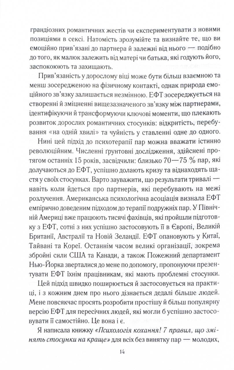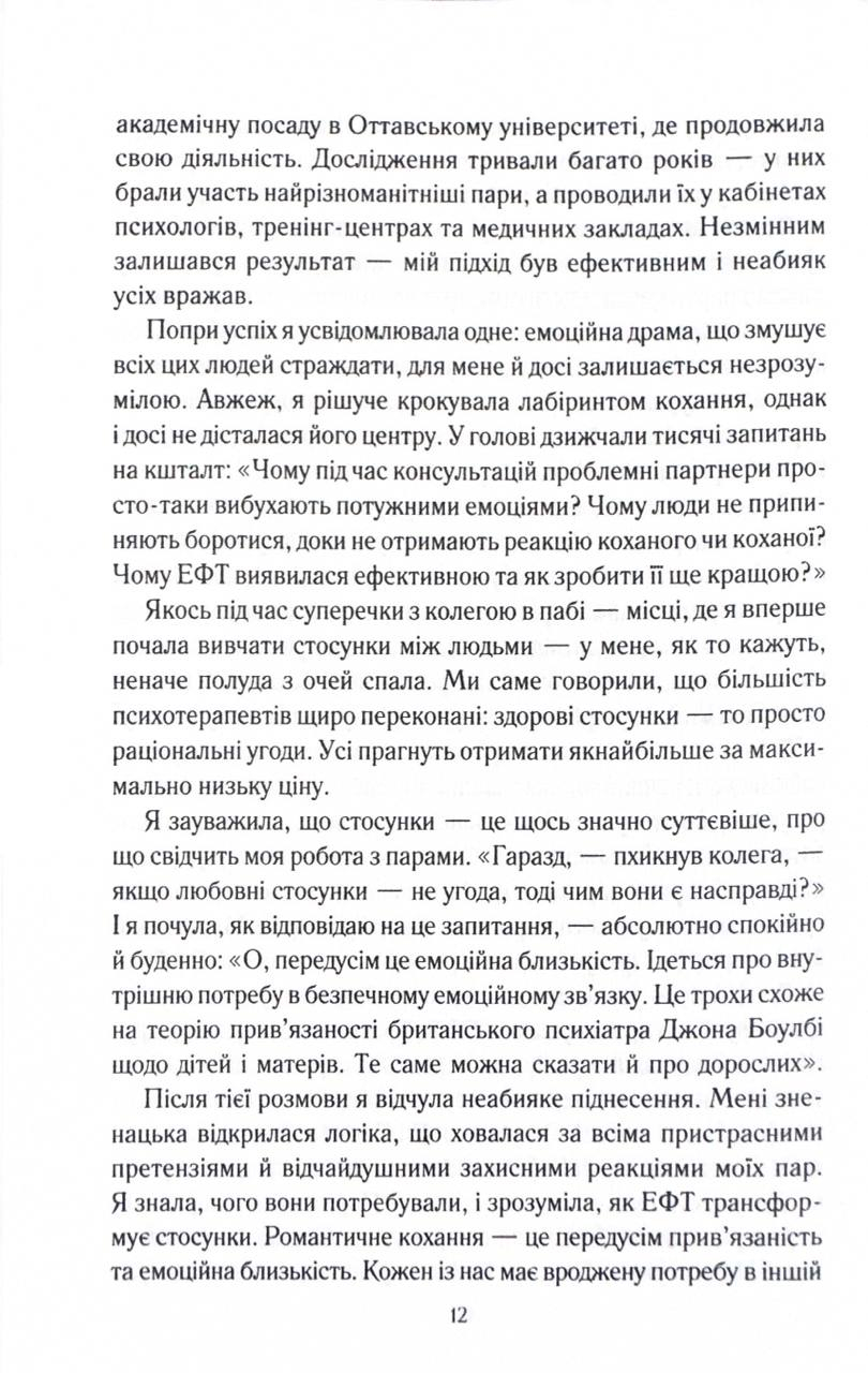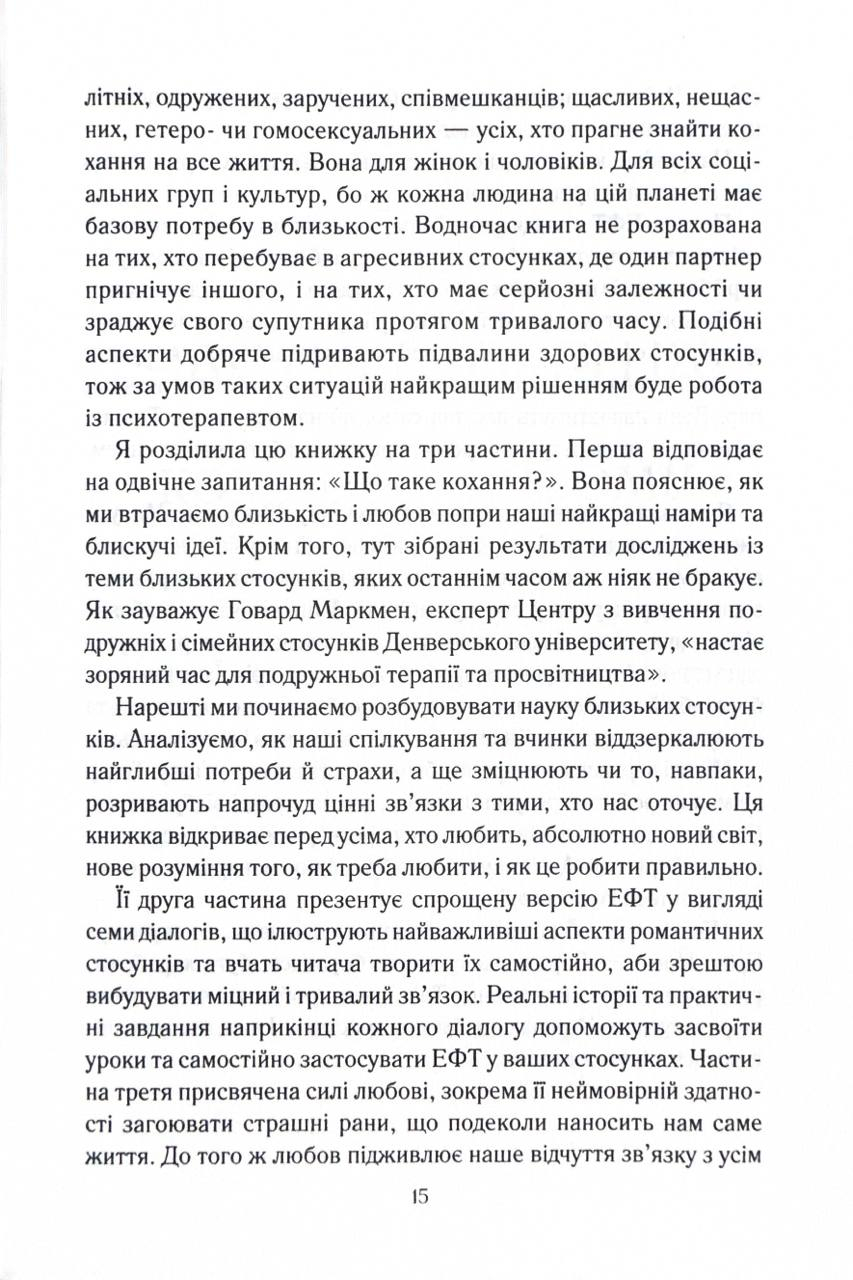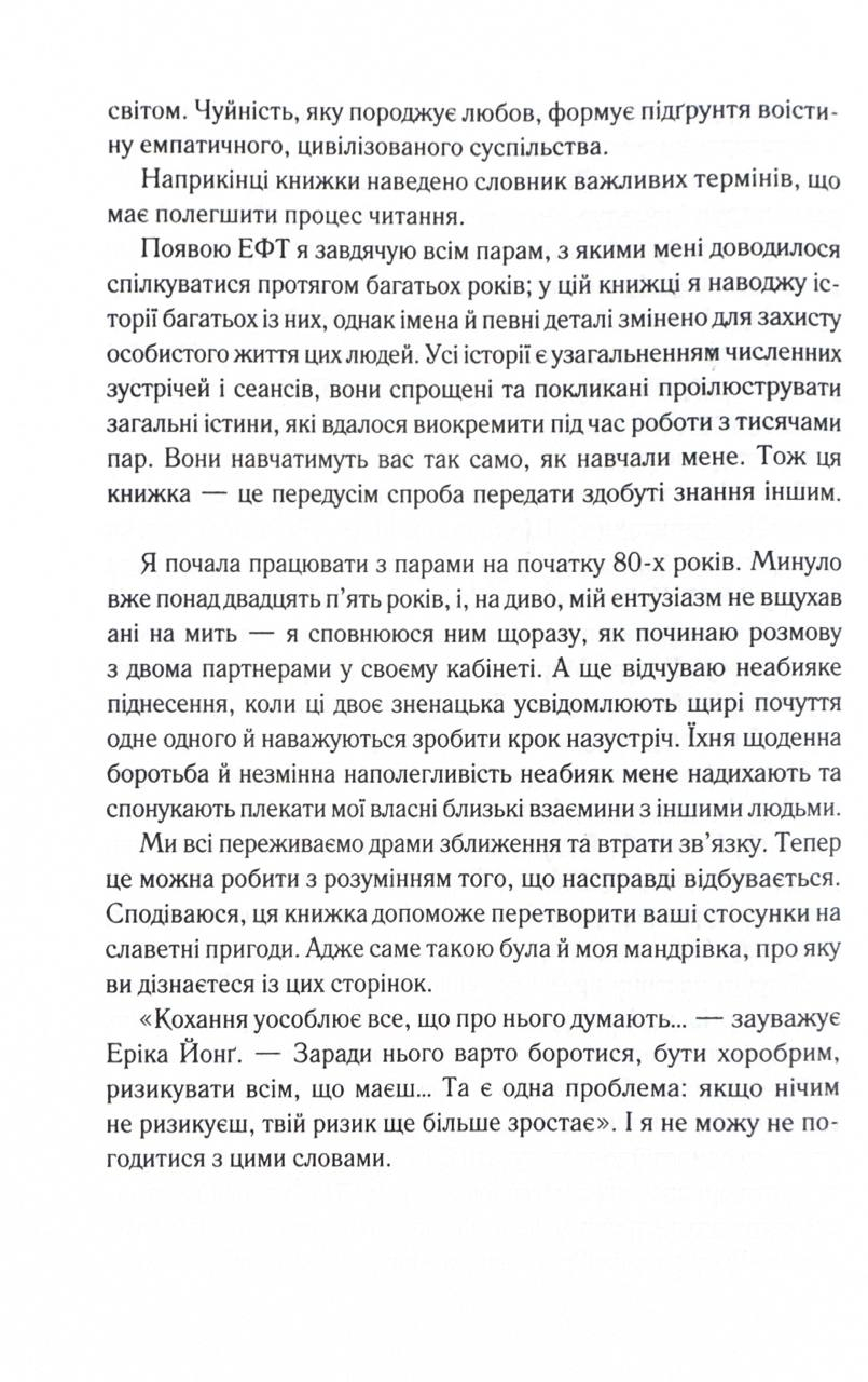 З дитинства ми мріємо про «кохання з першого погляду» та прагнемо «жити довго й щасливо». Проте персонажі казок ніколи не з’ясовують, чия черга виносити сміття чи мити посуд. Але чи можлива така ідилія в реальних стосунках? Докторка Сью Джонсон відкриває перед читачами абсолютно новий, сповнений любові світ щасливих і гармонійних стосунків. Її методи будуть корисними для всіх без винятку пар — молодих і літніх, одружених і ні, щасливих і нещасних, гетеро- і гомосексуальних, — для всіх, хто прагне зберегти кохання упродовж усього життя.