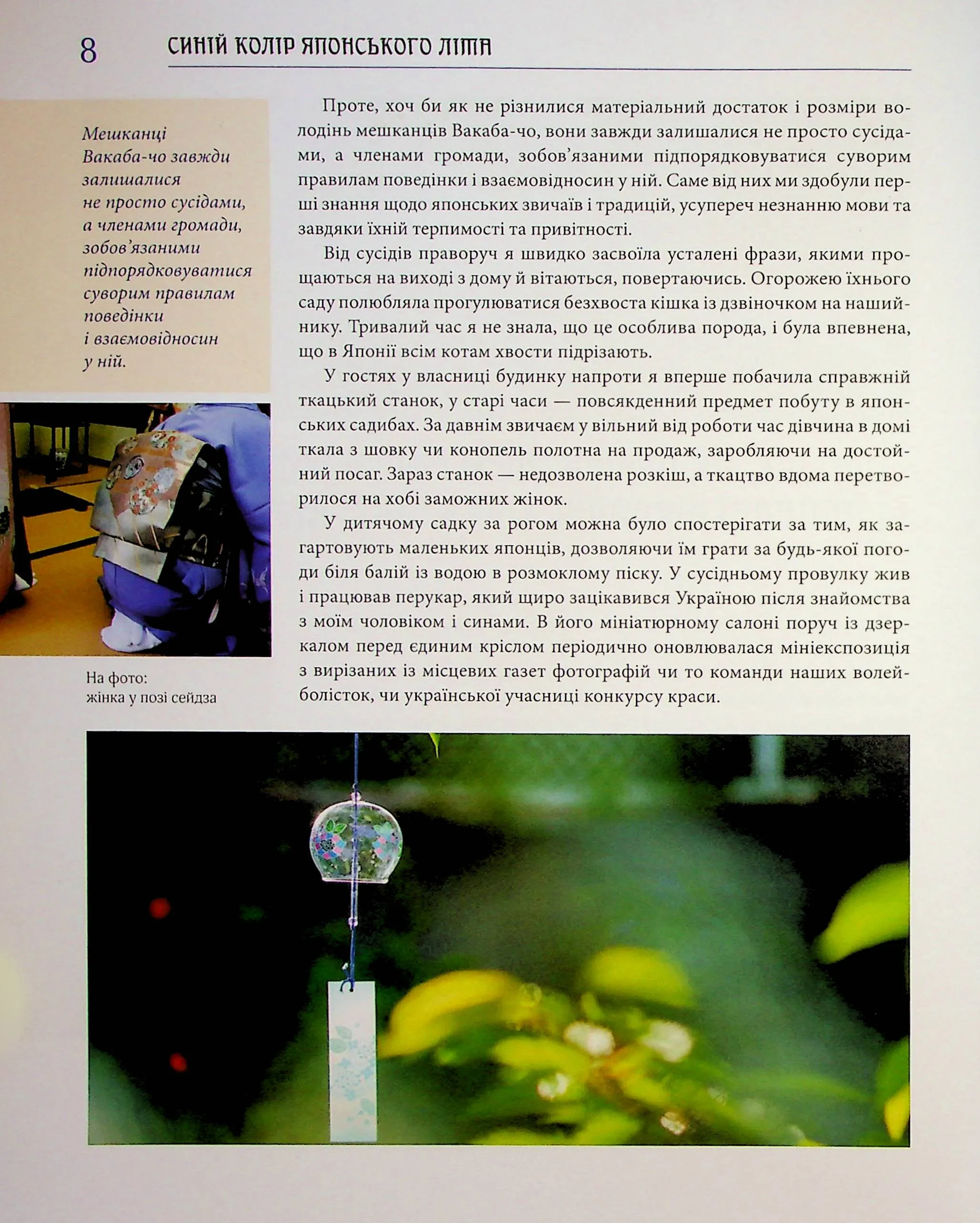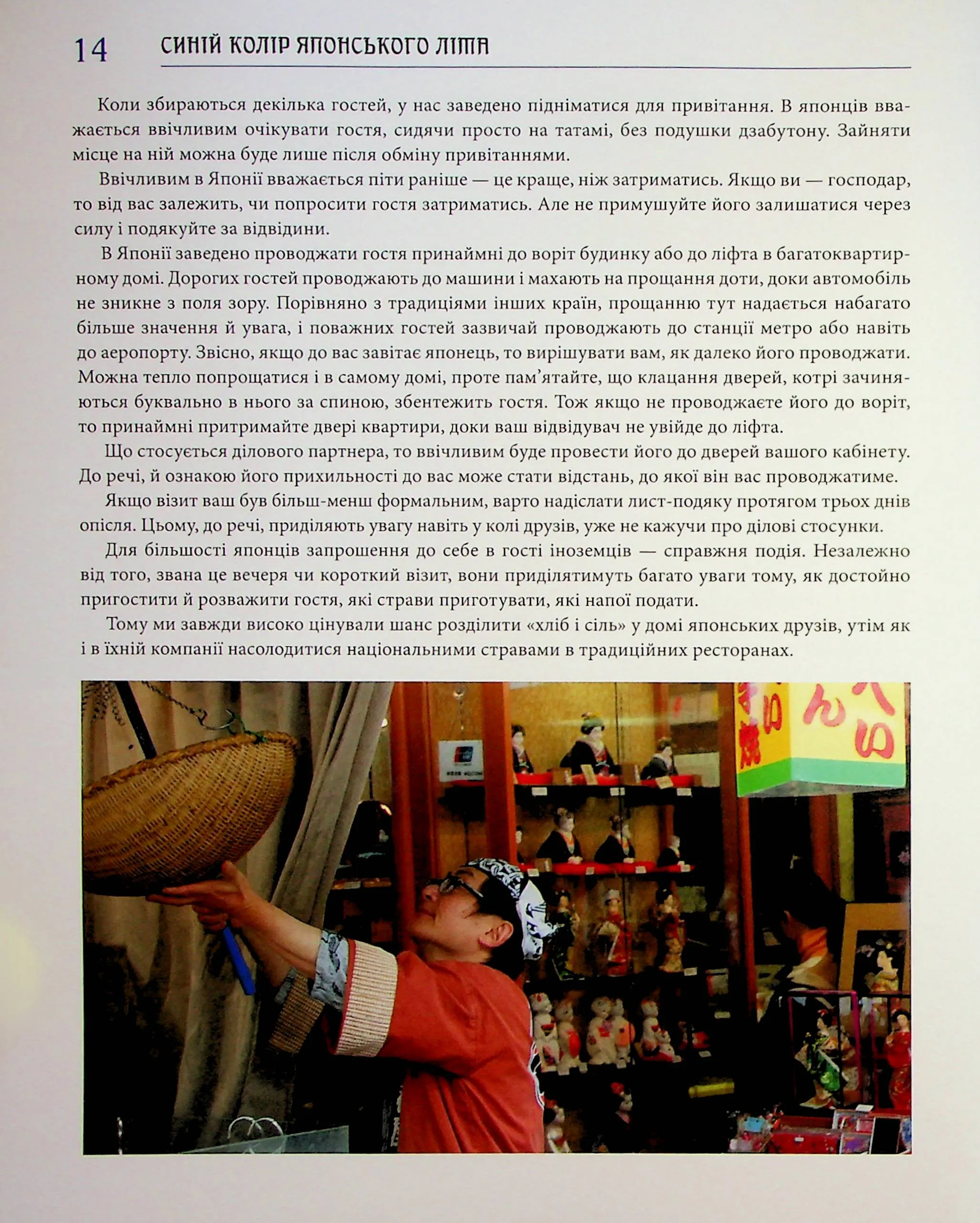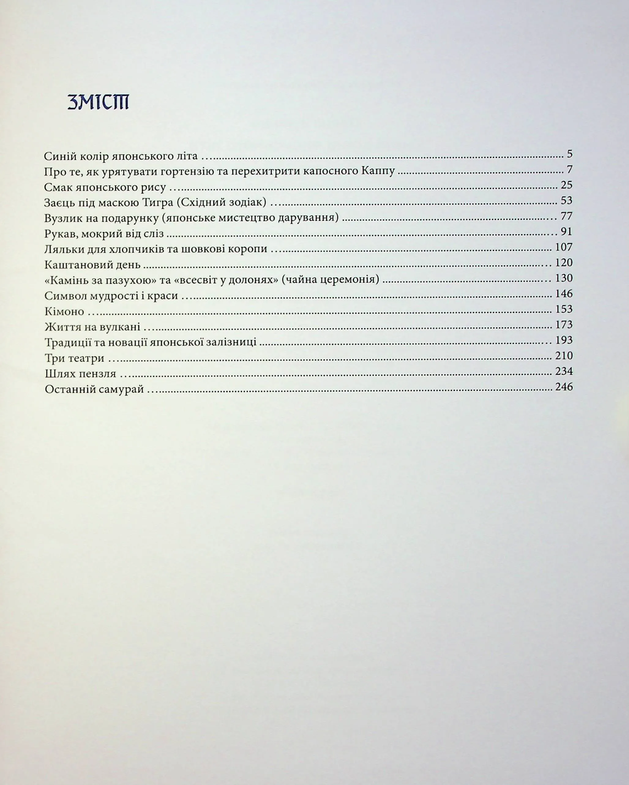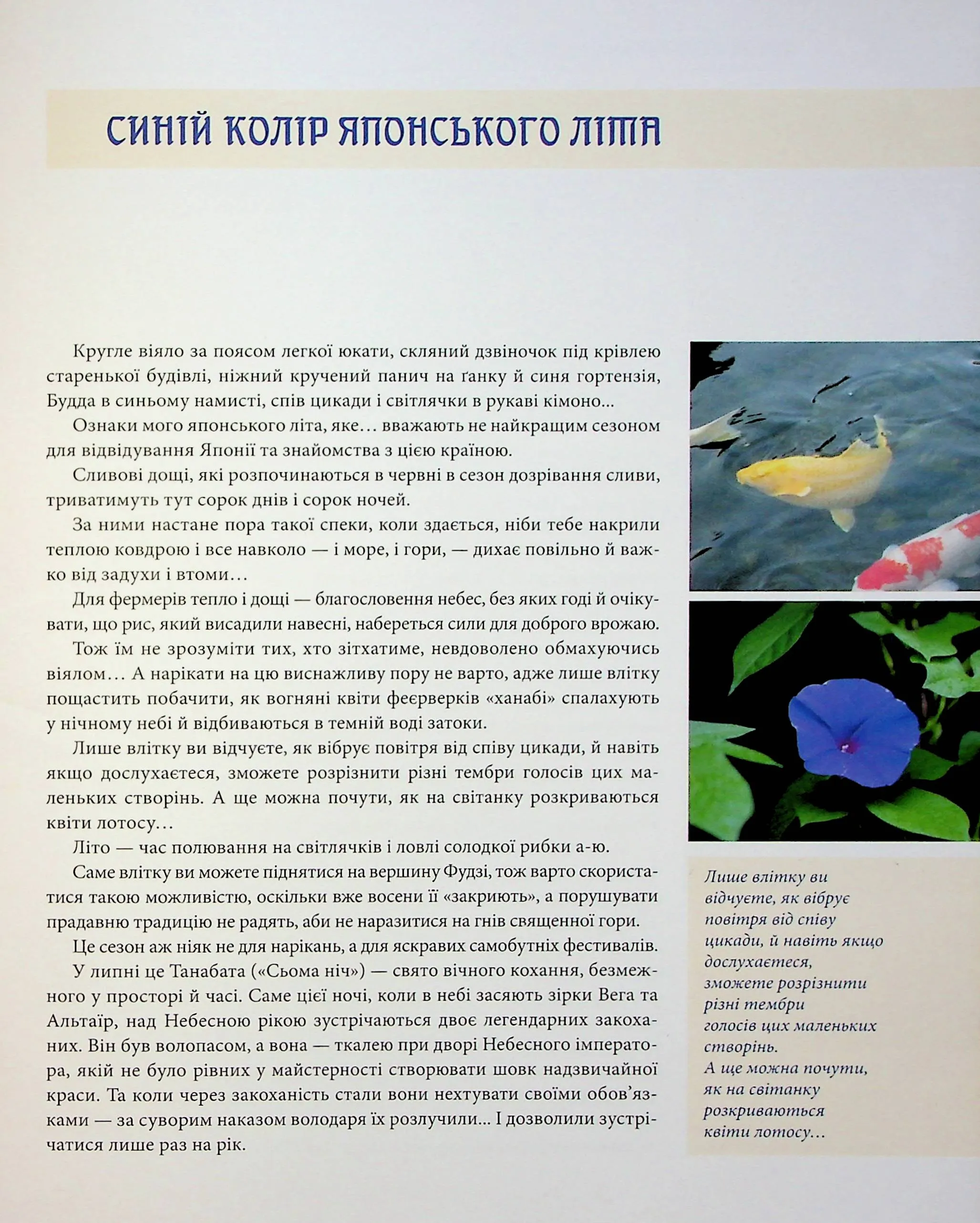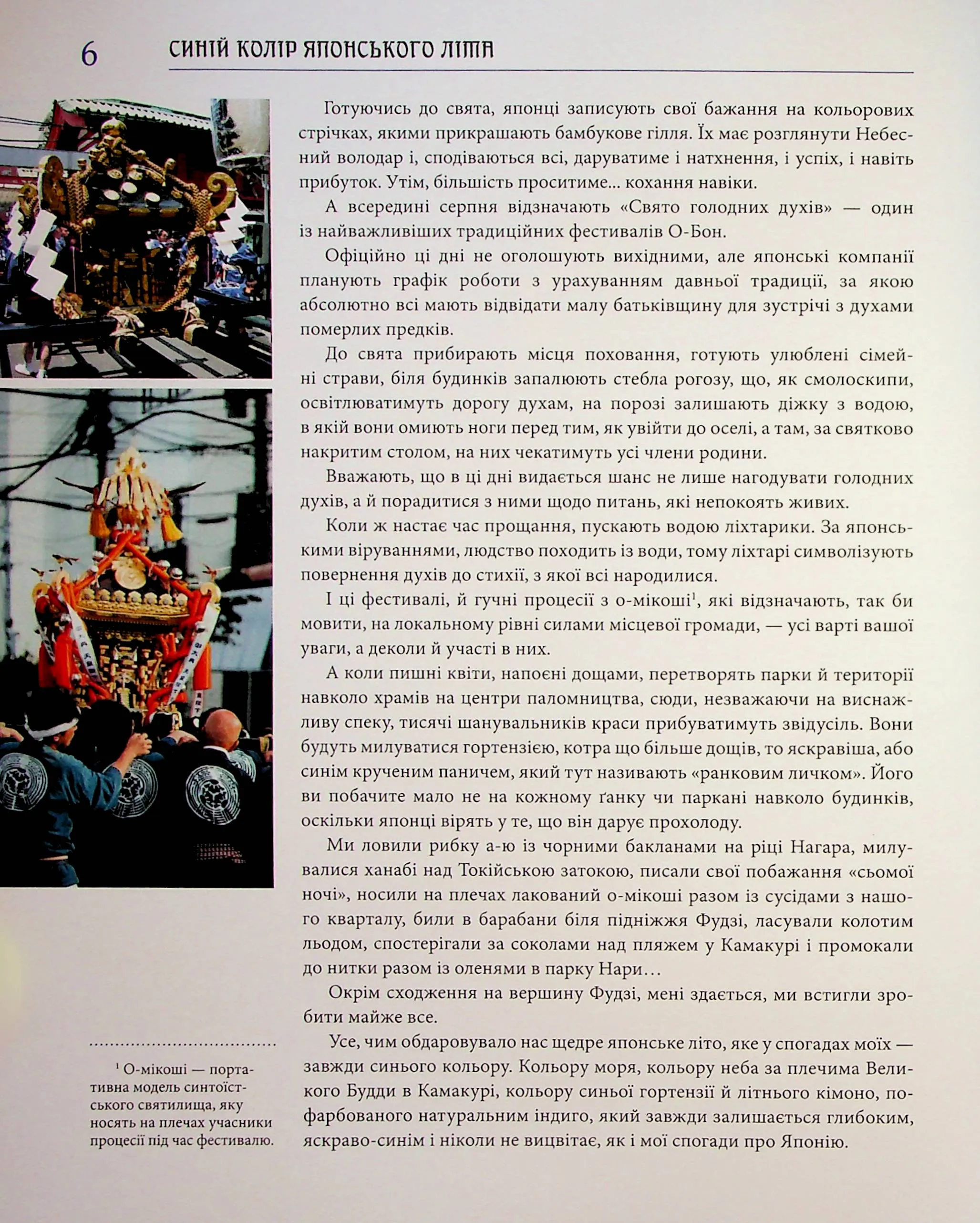 «Синій колір японського літа» — збірка есе, присвячених різним аспектам японської культури чайній церемонії, японській кухні, мистецтву каліграфії, правилам поведінки в різних життєвих ситуаціях (від відвідання ресторану до лазні) та значенню японських жестів, кімоно, традиціям святкування щорічних святкових подій, історії самураїв та їх ролі в суспільстві в наш час, тонкощам мистецтва дарування та величезному значенню вузлика на подарунку, лялькам, якими не грають, а тільки милуються.