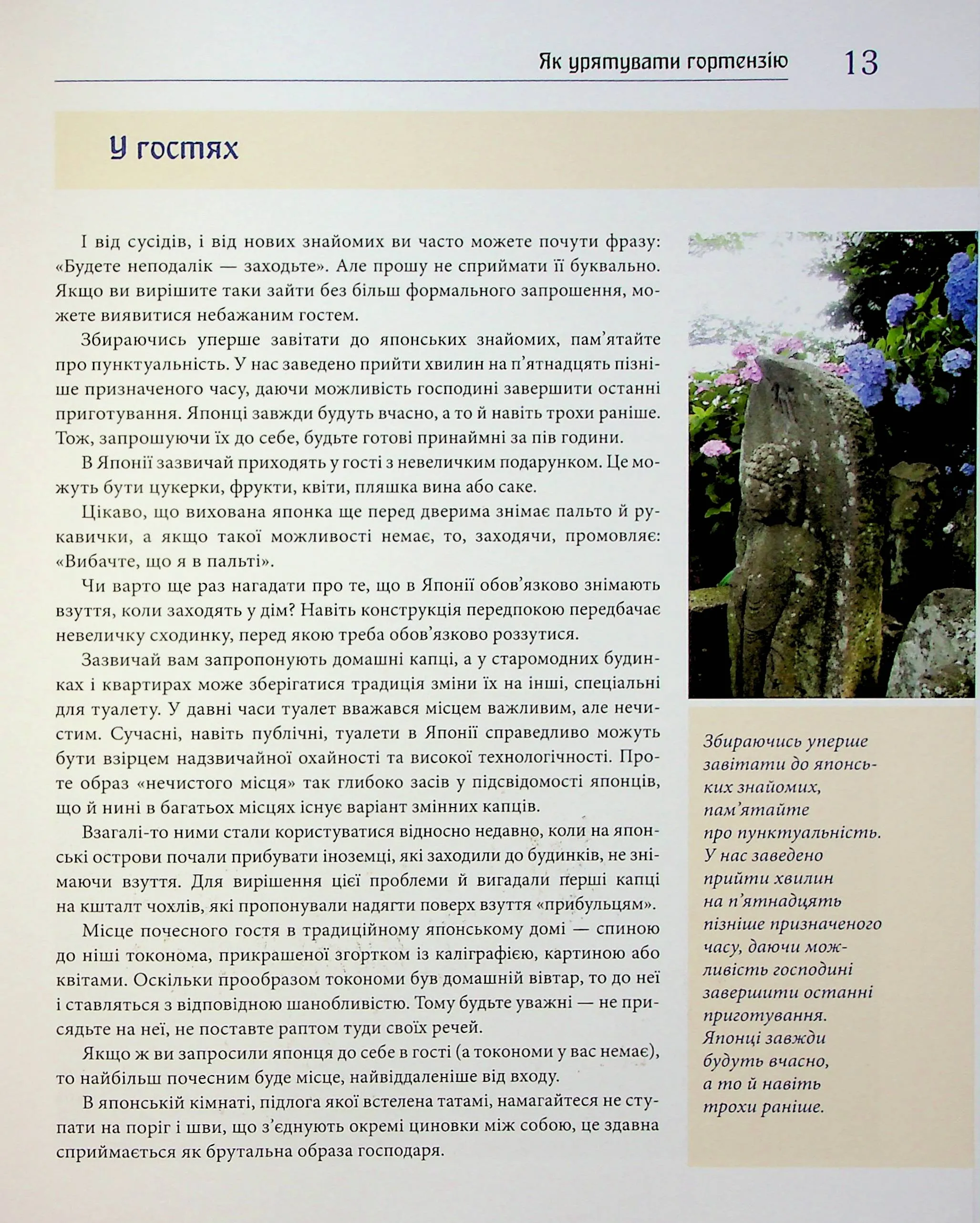 Когось може привабити можливість зазирнути за лаштунки традиційного театру Кабукі чи завітати до майстерні каліграфа. Тим, хто хоче взяти участь у чайній церемонії, квінтесенції естетики і культури Японії, варто прочитати про «Камінь за пазухою».