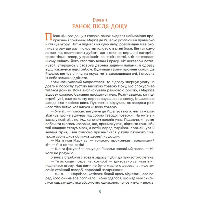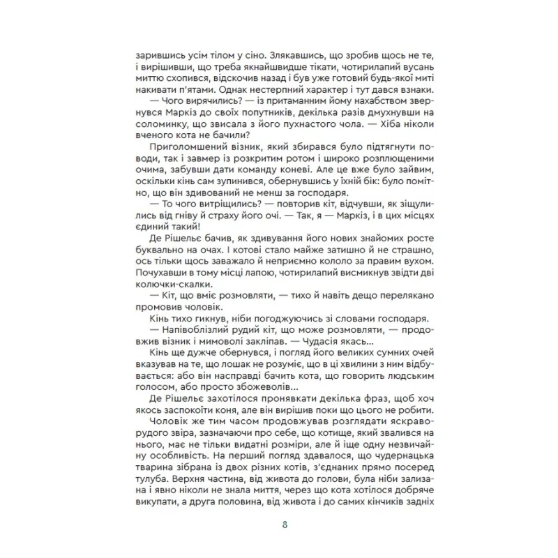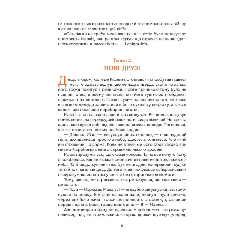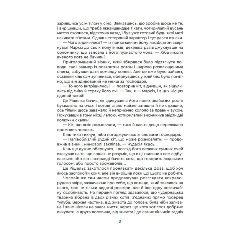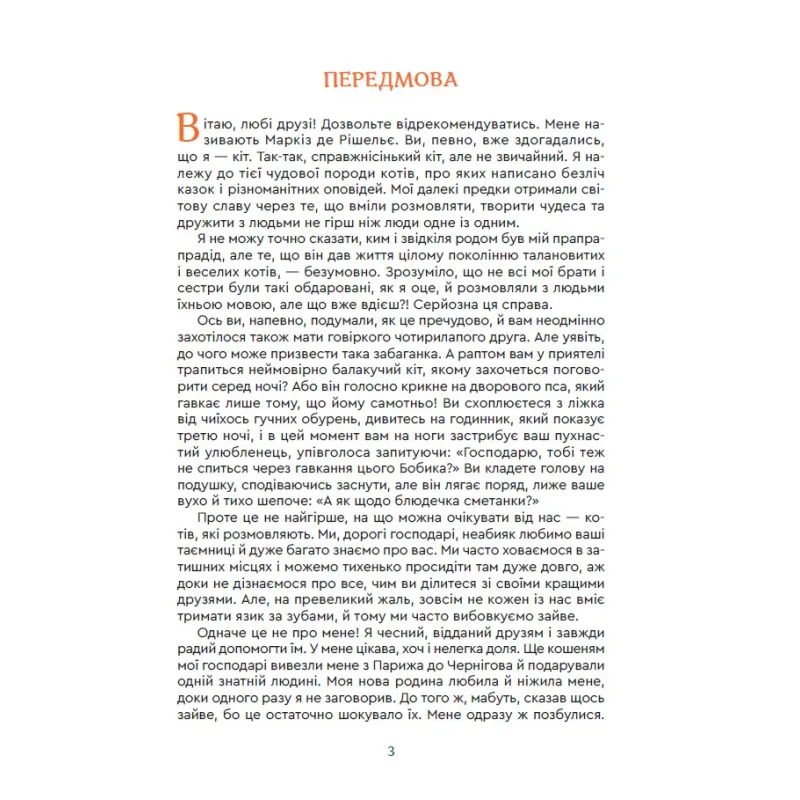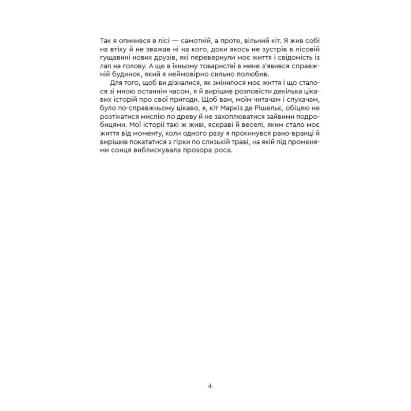 Один особливий рудошерстий кіт на ім’я Маркіз де Рішельє мріє про тепло й затишок власного дому, де його любитимуть і годуватимуть. Проте через свій дар говорити людською мовою він опинився в лісі, де спершу зустрів Богдана і його коняку Лізу, а тоді чорношерстого кота Анжі і ще багато-багато інших звірів, які стали Маркізові справжніми друзями й пліч-о-пліч піднялися в боротьбі проти злюк-відьом, бовдурів-мисливців, несправедливості й брехні. Чи зможуть лісові мешканці відстояти правду й добро, чи всі врятуються від чіпких кігтів орла-перевертня Залдана, що ж станеться з мрією де Рішельє і звідки на Лізиній морді з’явилося три червоні смужки? Про це і багато іншого на сторінках книги.