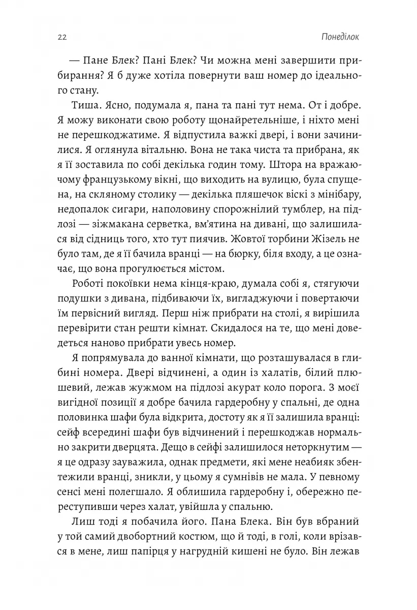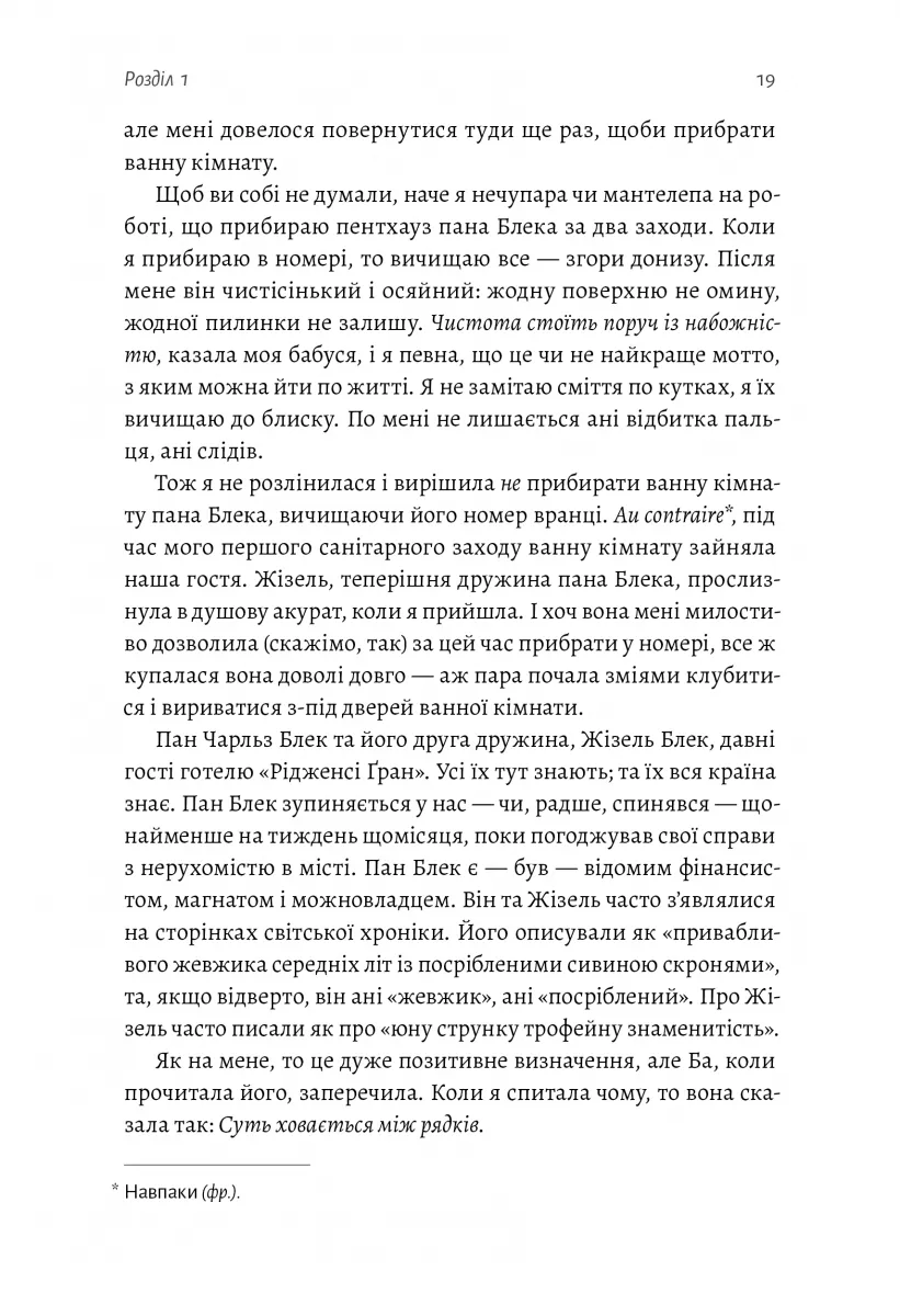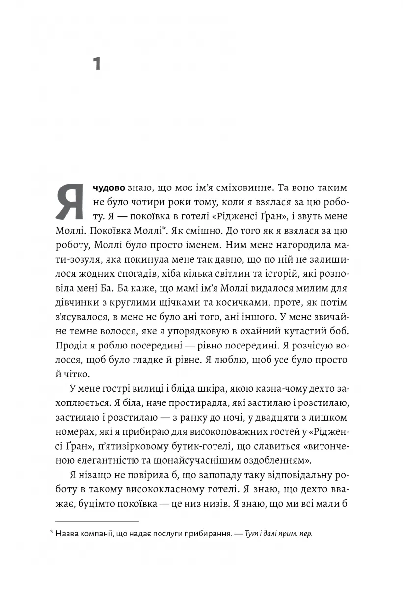 «Покоївка» — це роман, який крім захопливого детективного сюжету, пропонує поглянути глибше на життя людей, які не вписуються у соціальні стандарти. Чи вдасться усім нарешті побачити цю дивну невидиму покоївку? Чи зможе Моллі віднайти правду і довести свою невинність?
