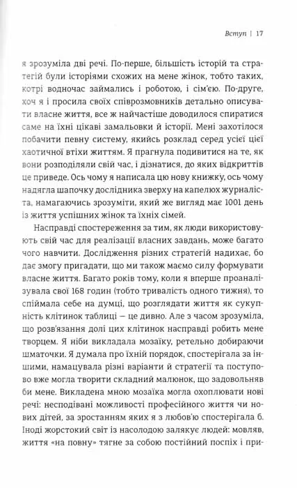 Експертка тайм-менеджменту Лора Вандеркам вирішила не сліпо довіряти балачкам, а зібрати перевірені дані. Вона проаналізувала хронометражі з життя жінок, які заробляють щонайменше $100 000 на рік, і на прикладі сотень історій довела: не варто відмовлятися від того, що ви дійсно любите, потрібно лише правильно організовувати свій час.