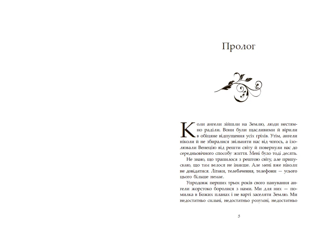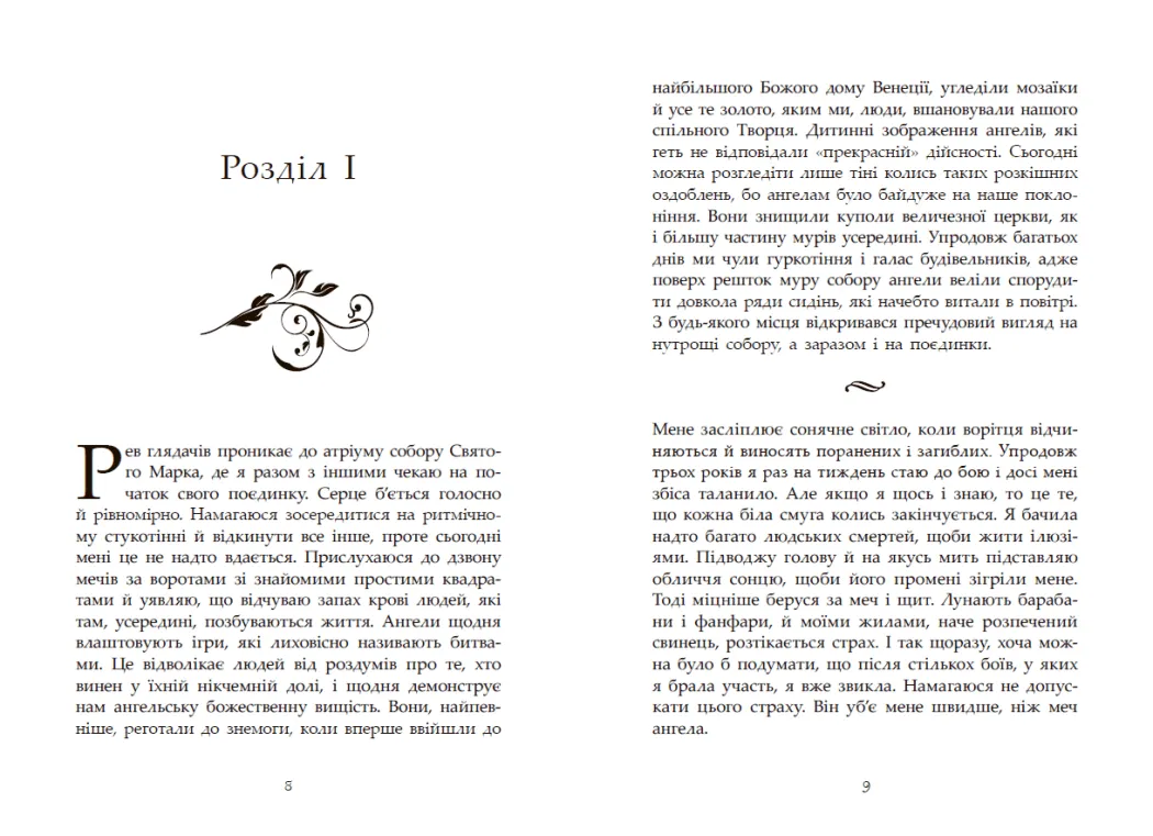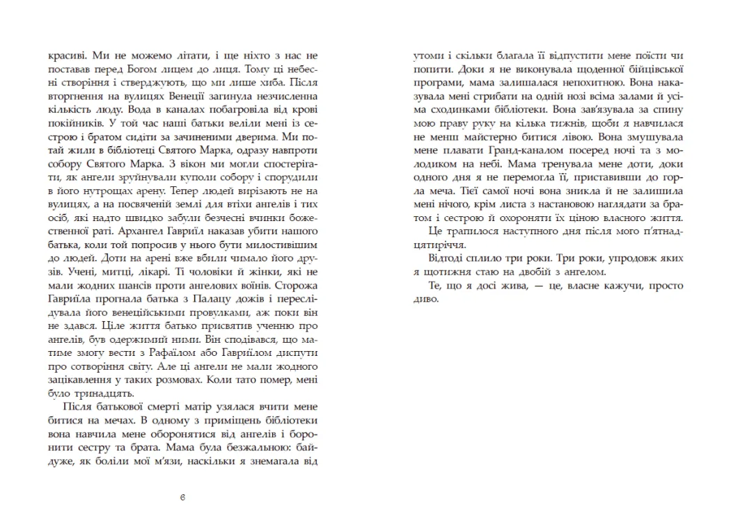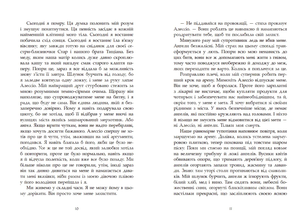 Одного дня це сталося. Вони спустилися з небес… Божественні сини, огорнуті блиском сили й слави. Небо затьмарили сотні крил, люди з піднесенням спостерігали цей прекрасний спектакль. …і світ перевернувся: звичний світ швидкісних потягів, інтернету й мобільних телефонів зник. Легенда стала реальністю. І це була геть не та легенда, про яку торочила церква. Венеція, як і решта людських поселень, окупована безжальним небесним воїнством. Юна Мун веде власну майже безнадійну боротьбу заради брата та сестри. Вона разом з іншими людьми-гладіаторами виходить на арену проти ангелів, найпрекрасніших, найбезжальніших, найсмертоносніших супротивників. І ці крилаті створіння більше не введуть Мун в оману своєю довершеністю. Вона взагалі не довіряє нікому, найменше — ангелу…
