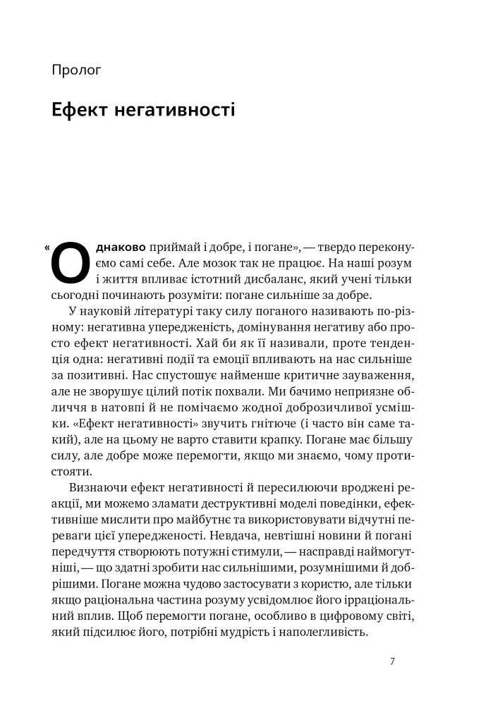 Чому нас спустошують слова критики, навіть якщо вони змішані зі щедрою похвалою? Тому що наш мозок сконцентрований на поганому. Цей негативний ефект пояснює велике і мале: чому країни впадають у катастрофічні війни, чому пари розлучаються, чому люди пропускають співбесіди на роботу, чому футбольні тренери тупо кидаються на четверте місце. Протягом усього дня сила поганого керує настроєм людей, стимулює маркетингові кампанії та домінує в новинах та політиці.