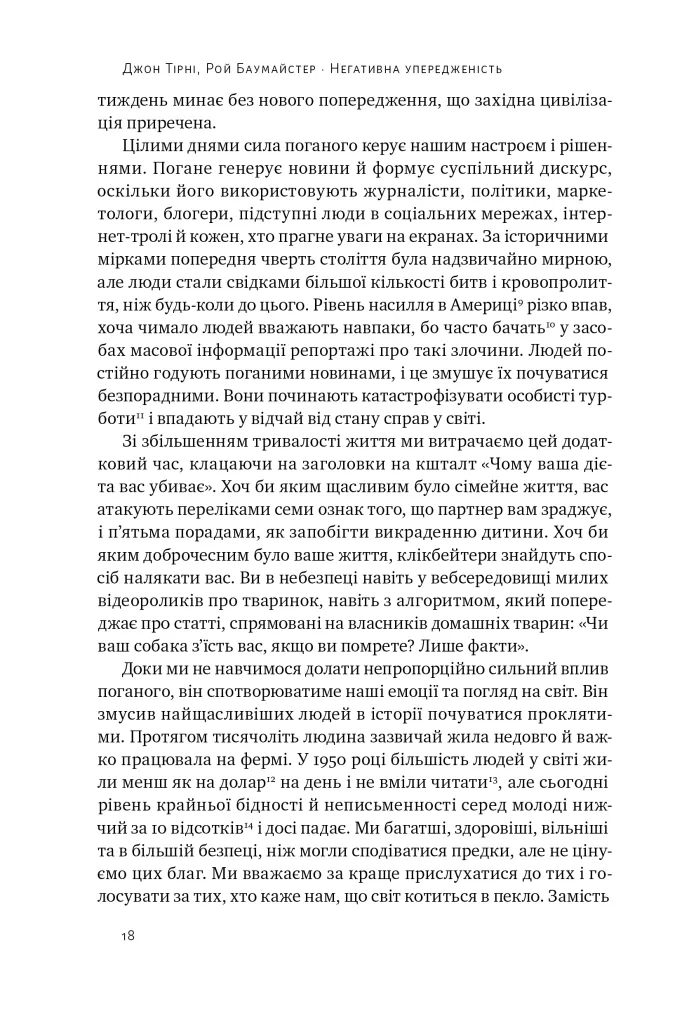 Негативне упередження нашого мозку має еволюційний сенс, оскільки воно тримало наших предків напоготові до фатальних небезпек, але воно спотворює нашу перспективу в сучасному медіа-середовищі. Безперервний шквал поганих новин і розпалювання криз змушує нас почувати себе безпорадними і змушує нас боятися і злитися. Ми ігноруємо наші численні благословення, воліючи прислухатися до голосів, які говорять нам, що світ піде до пекла.