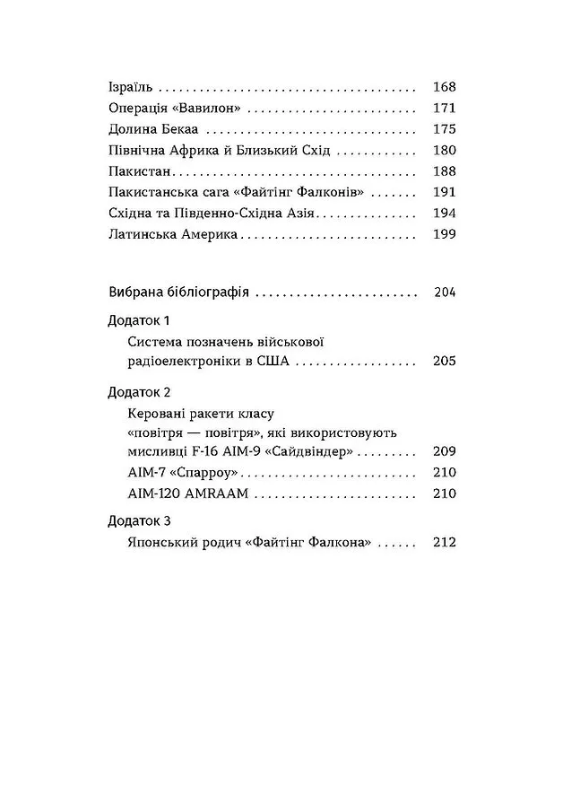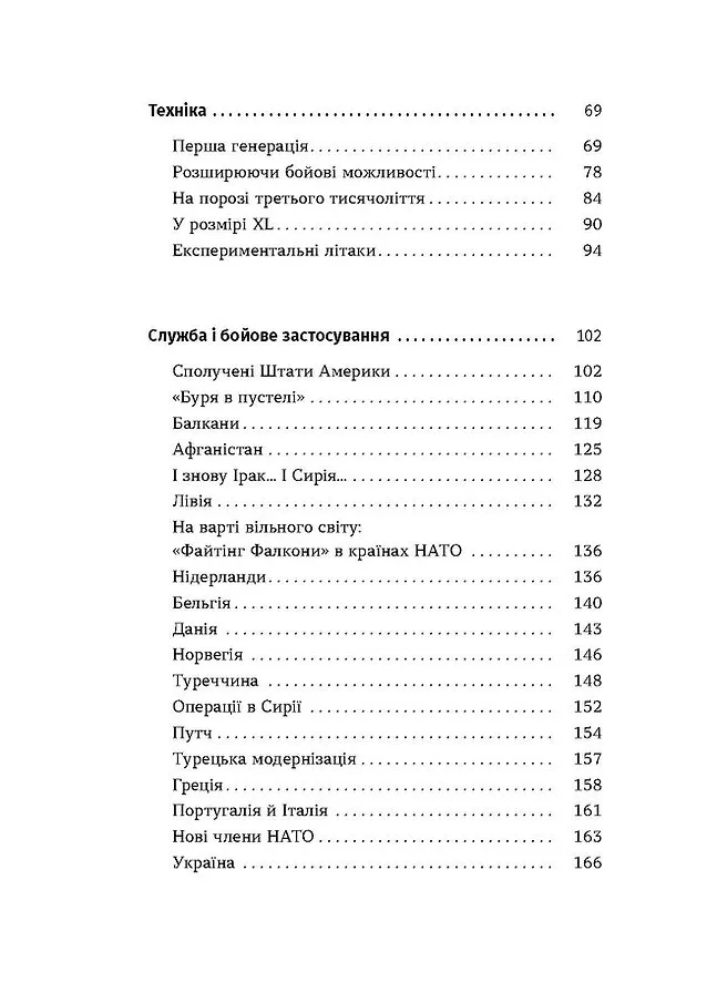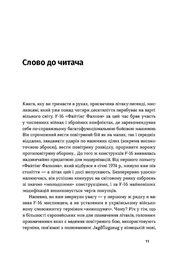 «За всю свою історію мисливець F-16 пройшов кілька етапів удосконалення. Зміни часом були досить суттєвими, унаслідок чого літак перетворився з «чистого» мисливця, здатного вести лише ближній повітряний бій, на багатофункціональну машину, спроможну вирішувати більшість завдань сучасної війни в повітрі». Цю книжку присвячено літаку-легенді, який уже понад 40 років перебуває на варті вільного світу. F-16 спроможний вести повітряний бій, завдавати ударів по наземних цілях, вести розвідку й проривати ворожу ППО. Автор розповість історію виробництва та численних модифікацій F-16, опише службу в різних країнах й участь літака у війнах і збройних конфліктах. Читач дізнається про рейд ізраїльських F-16 на іракський ядерний центр, турецького льотчика, що збив російський бомбардувальник, пакистанських пілотів, які збивали радянські штурмовики над Афганістаном, про наймасовіше застосування F-16 під час операції «Буря в пустелі».